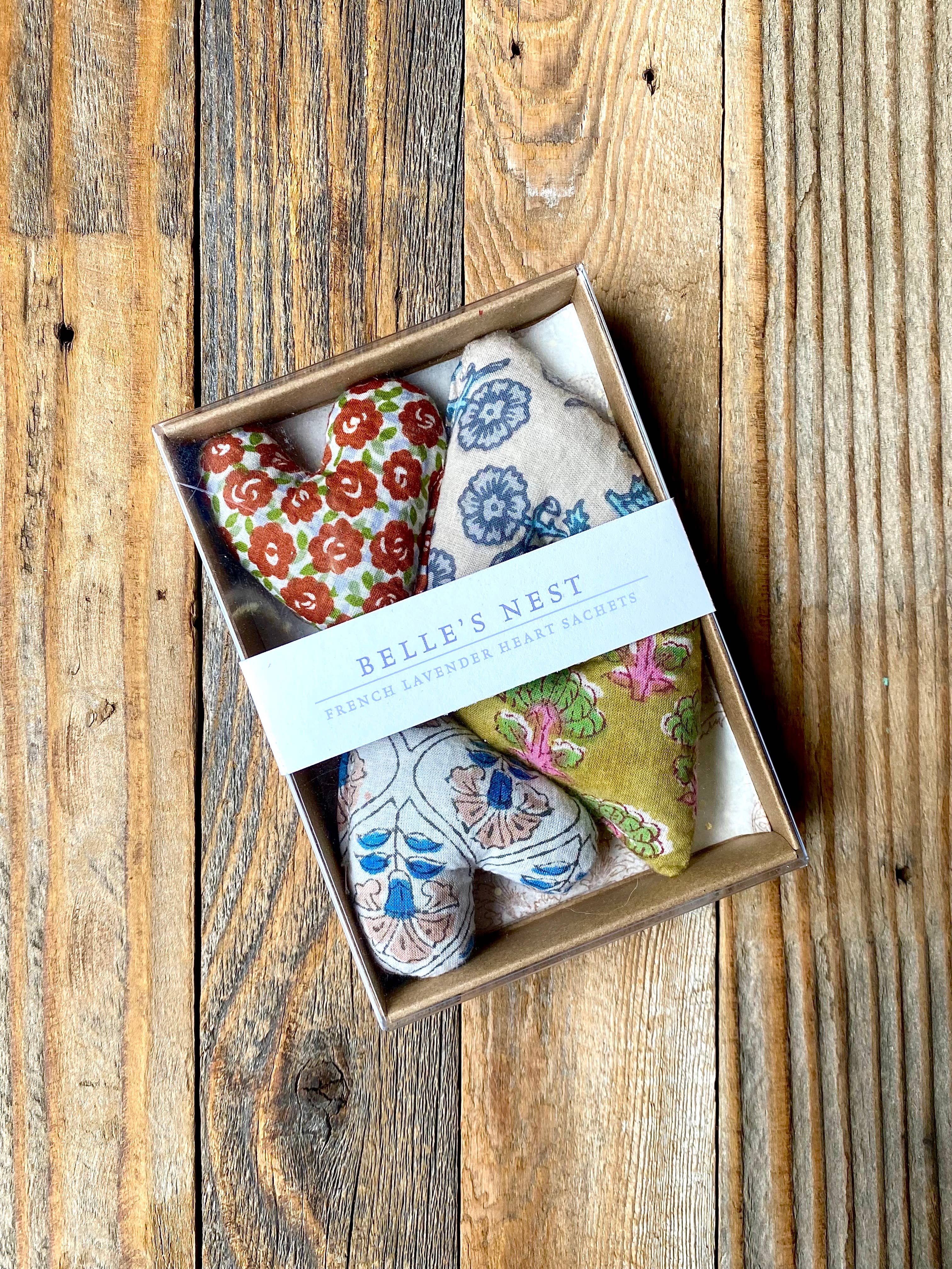 Boxed Set of 4 Mini Lavender Heart Sachets A nice option for those who are looking for a boxed gift. Each box will contain 4 Mini Lavender Heart Sachets/Tokens - Assorted colors and patterns. Lavender filled, cotton printed fabric.