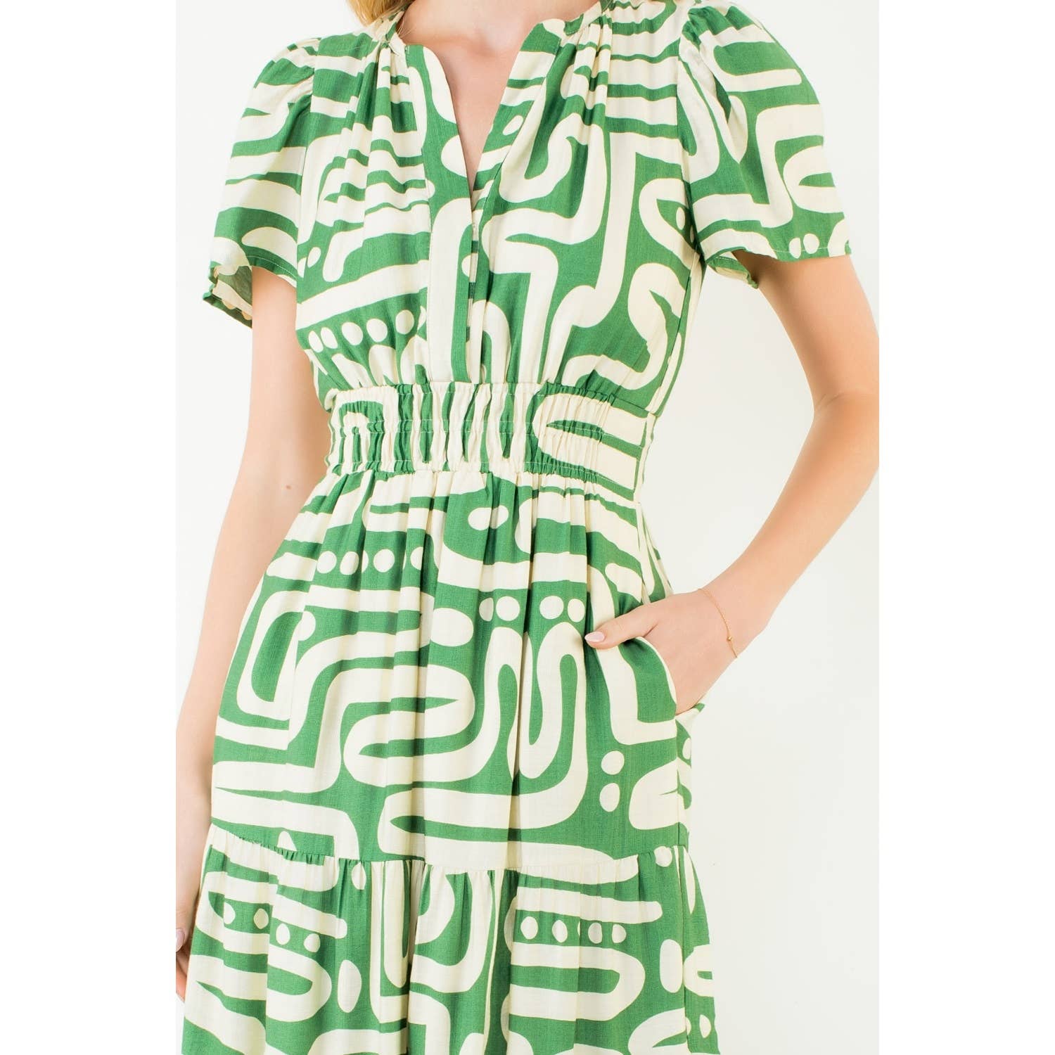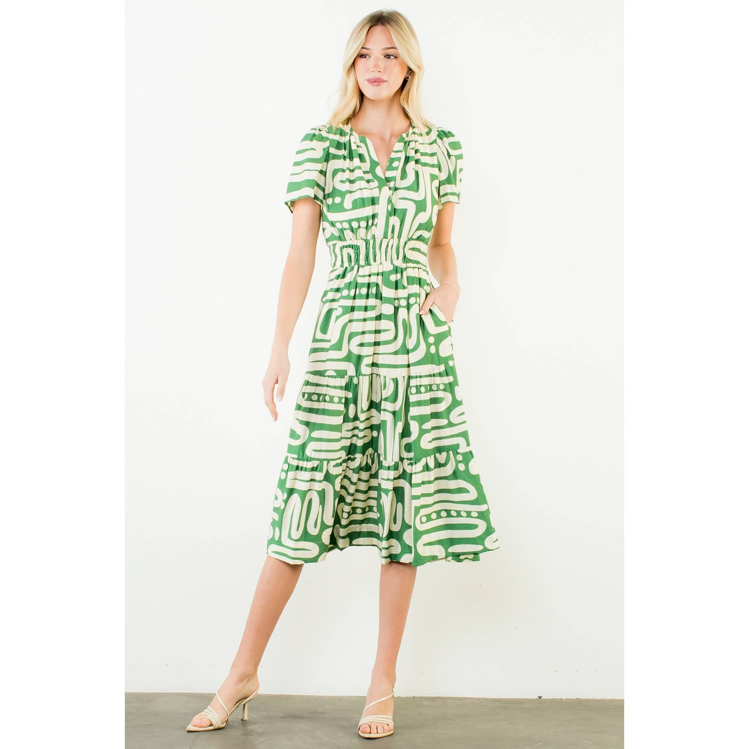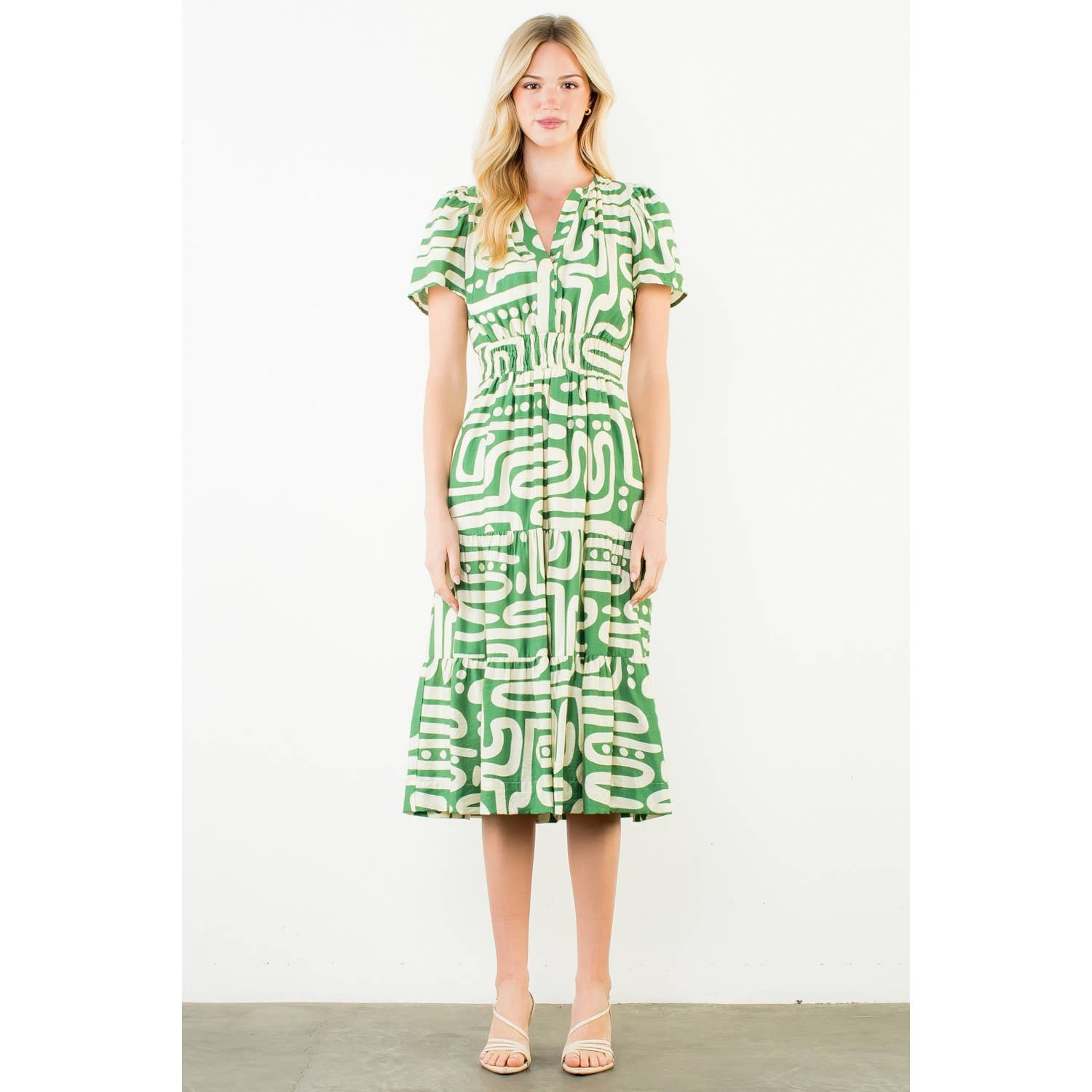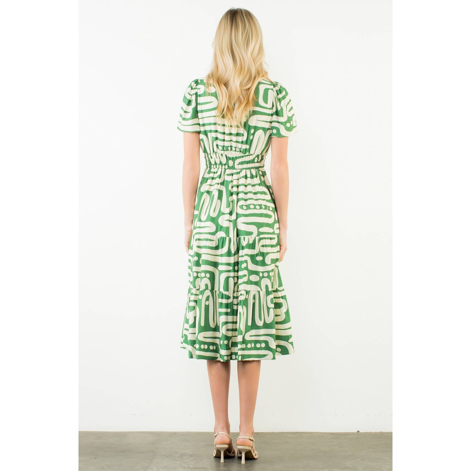 SHORT SLEEVE PATTERN TIERED MIDI DRESS - GREEN