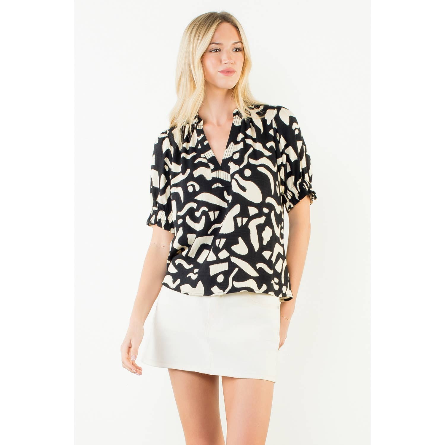 EMBROIDERED SHORT SLEEVE PRINT TOP - BLUE