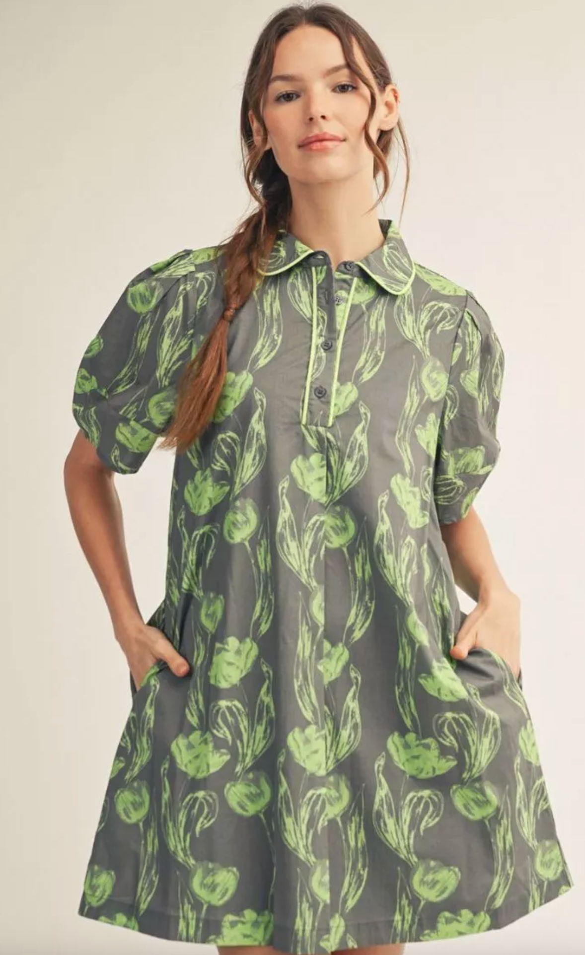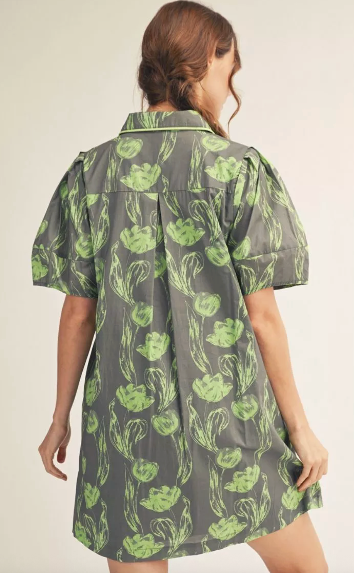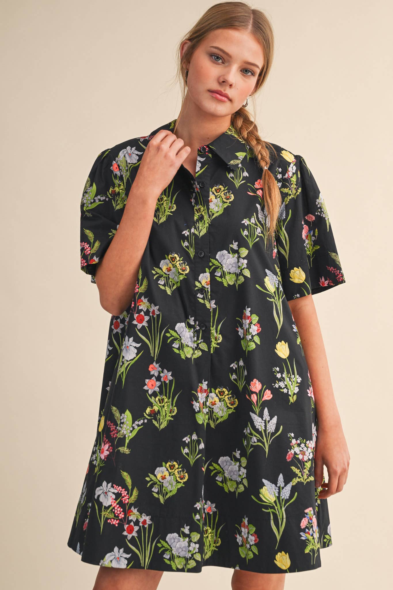 FLORAL SHORT SLEEVE BUTTON DOWN MINI DRESS - BLACK FLORAL