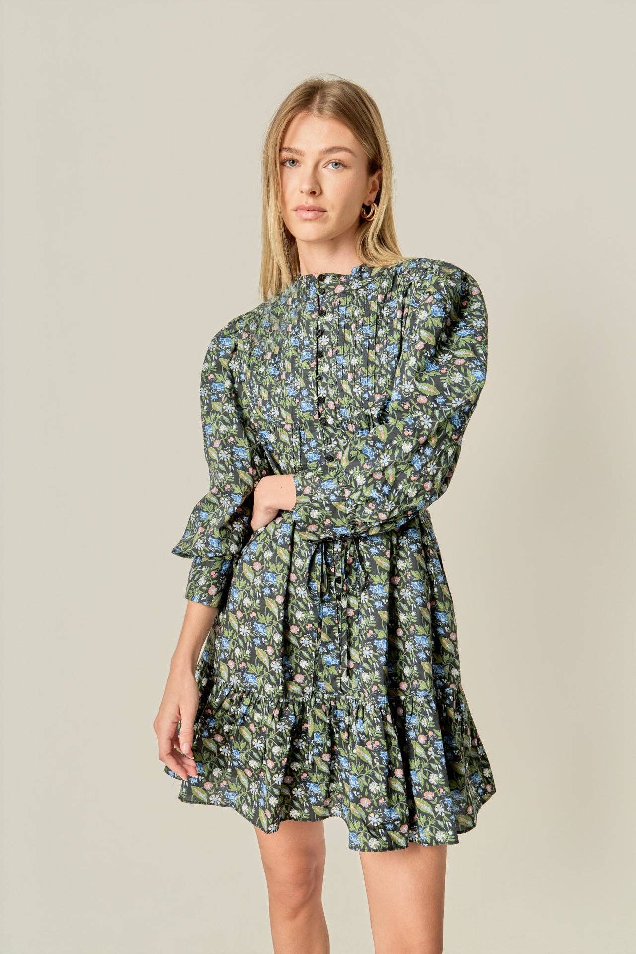 FLORAL PRINT PINTUCK SMOCK MINI DRESS - BLACK MULTI