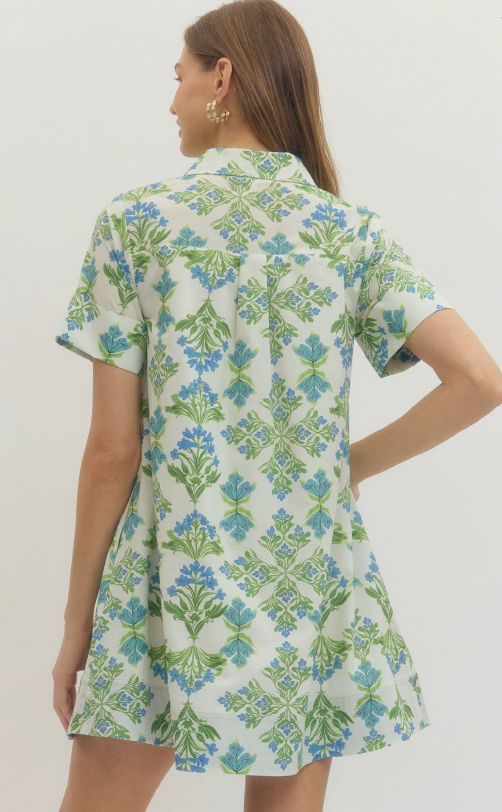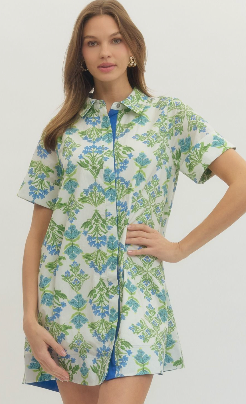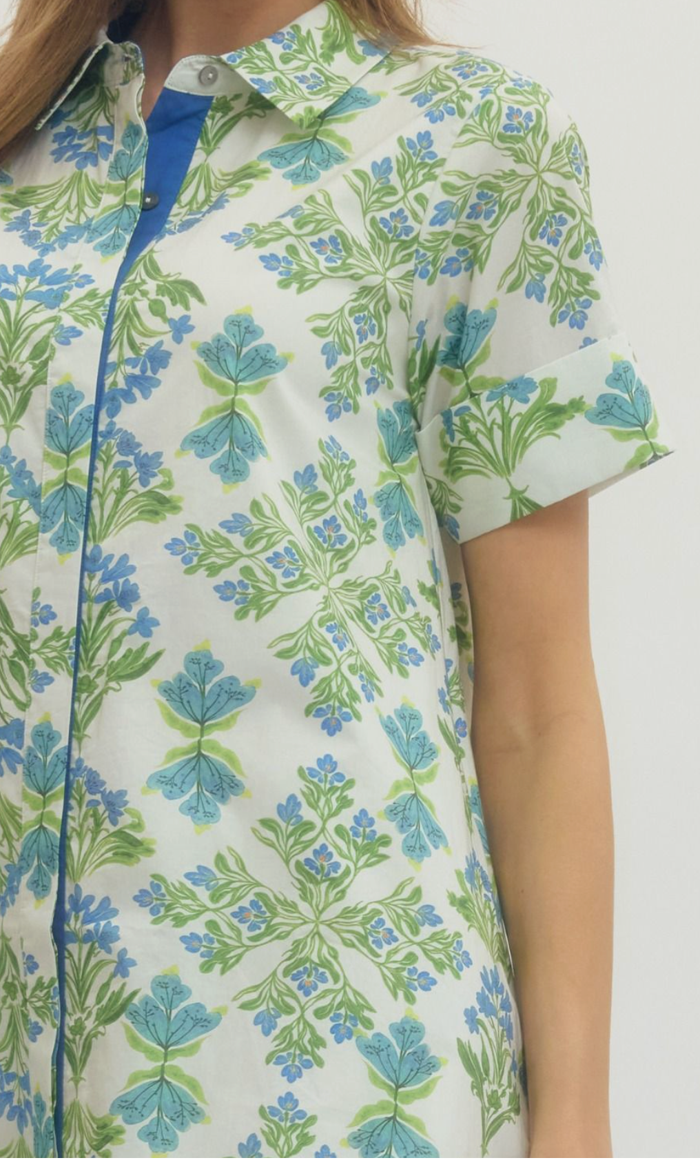 RUFFLED BUTTON DOWN FLORAL MINI DRESS - IVORY BLUE FLORAL