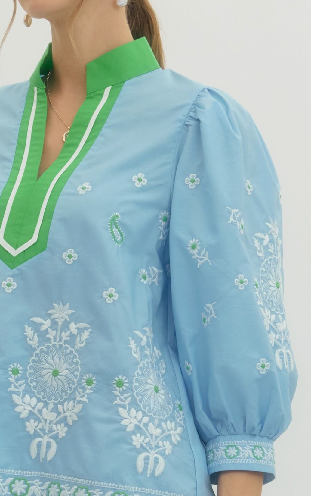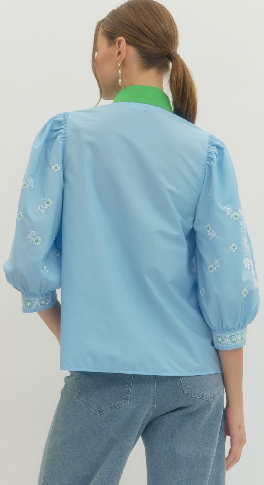 FLORAL EMBROIDERED 3/4 PUFF SHORT SLEEVE TOP - BLUE
