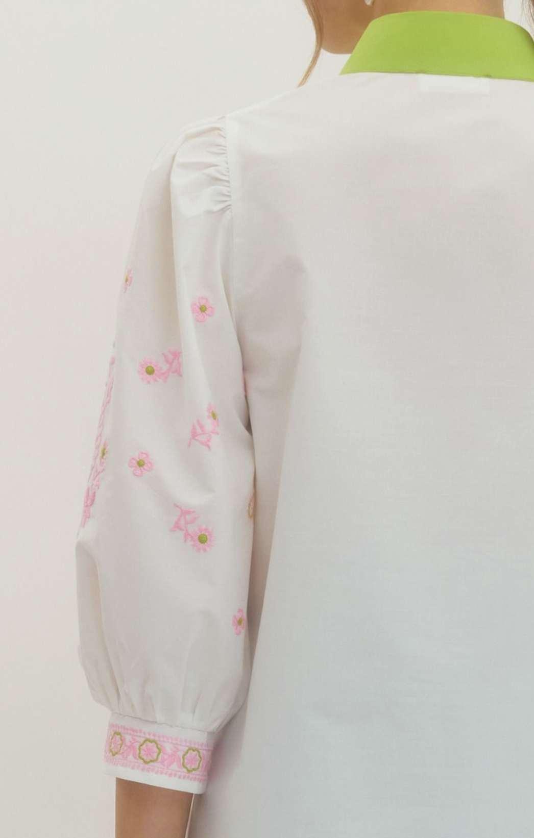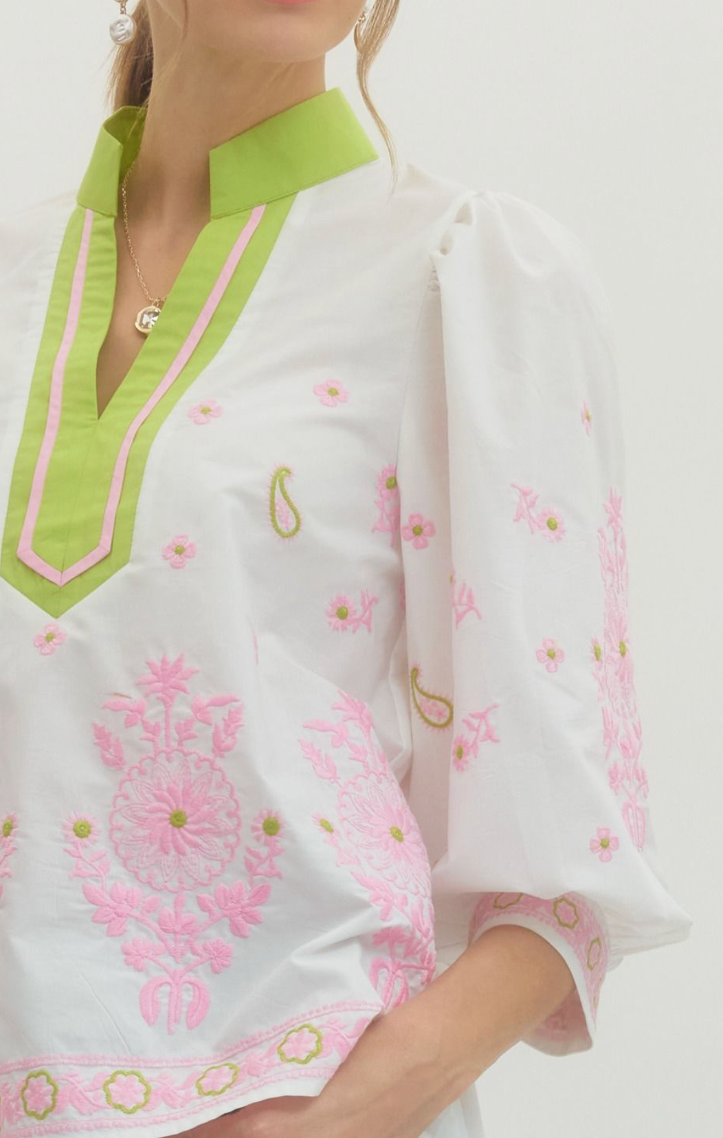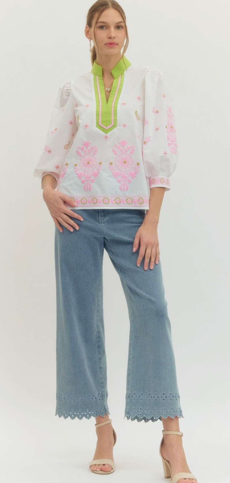 FLORAL EMBROIDERED 3/4 PUFF SHORT SLEEVE TOP - OFF WHITE