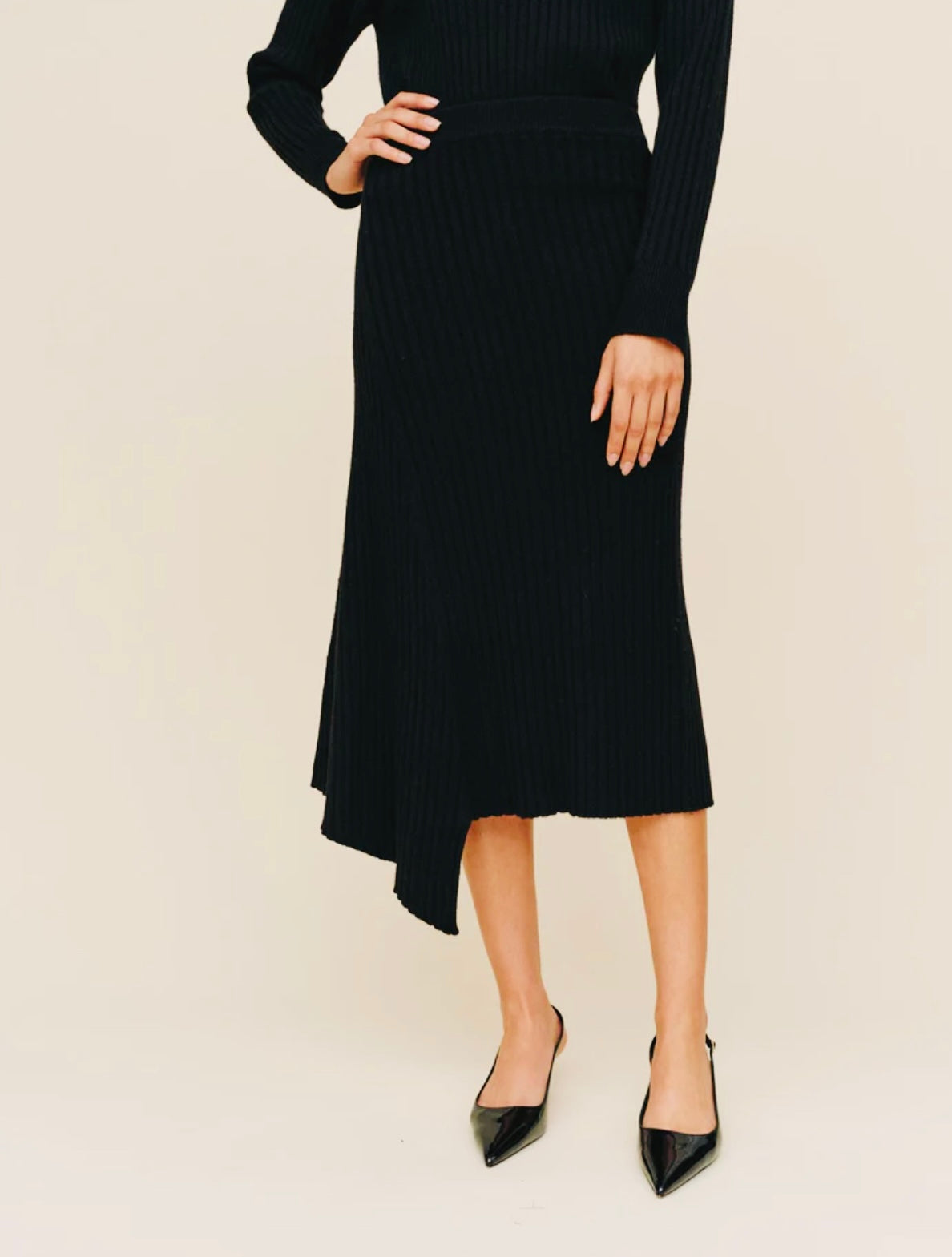 The Asymmetric Hem Skirt is crafted in a soft knit with ribbed detailing and an uneven hemline that gives the silhouette a contemporary twist.