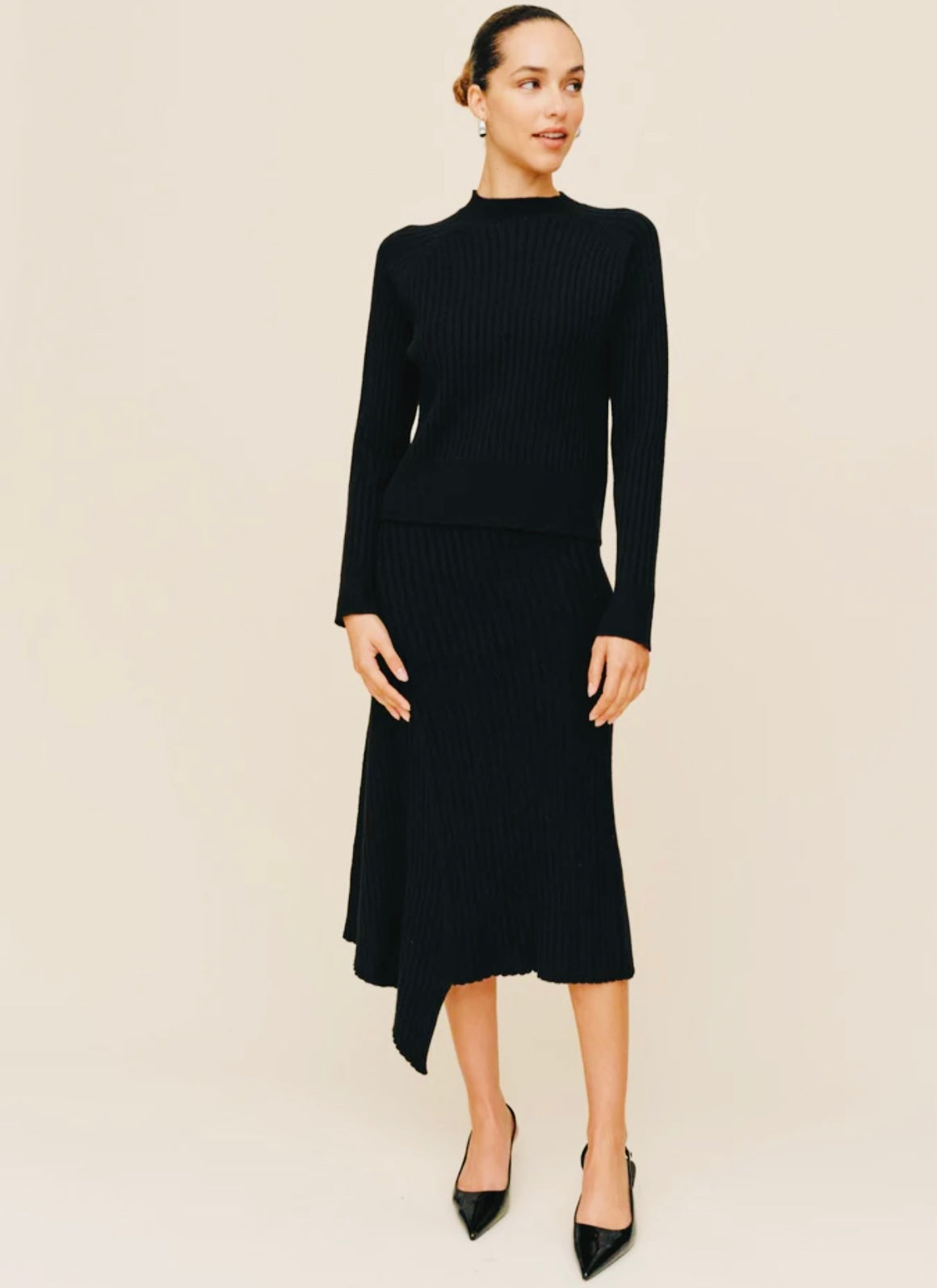 Sleek and textural, the Raglan Ribbed Sweater is designed with a mock neckline and clean ribbing for a modern finish. Pair it with the Asymmetric Hem Skirt for a coordinated set or wear it solo as an elevated knit.