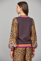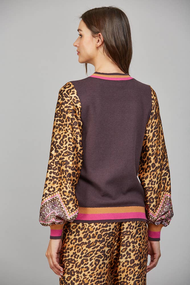 CONTRAST ANIMAL PRINT SLEEVE CREW NECKLINE SWEATER - BROWN
