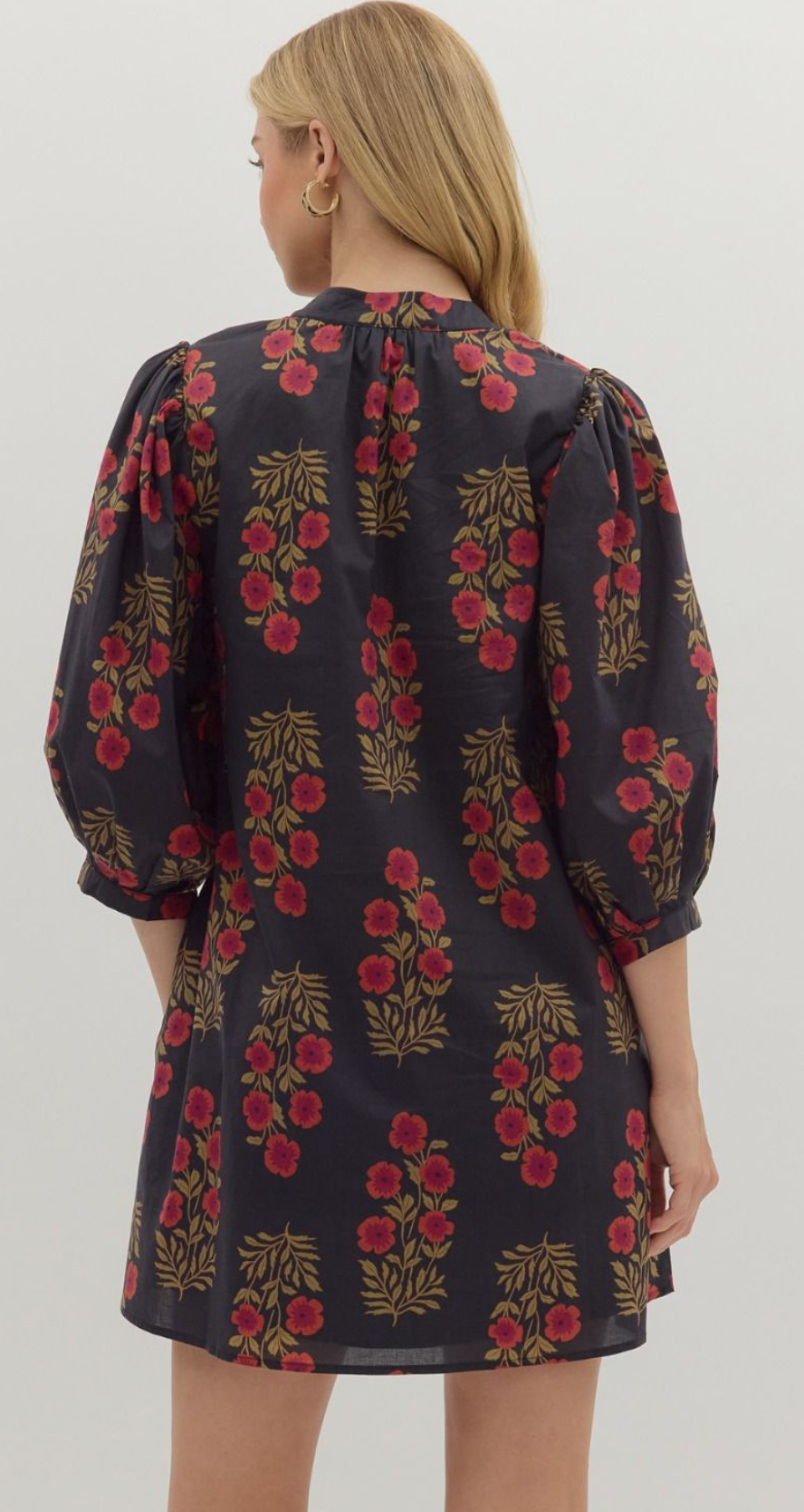 FLORAL PATTERN V-NECK MINI DRESS - BLACK