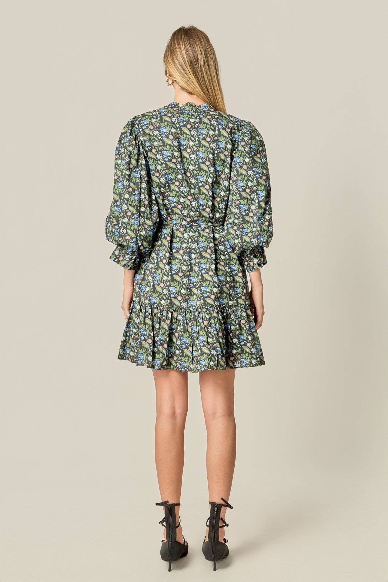 FLORAL PRINT PINTUCK SMOCK MINI DRESS - BLACK MULTI