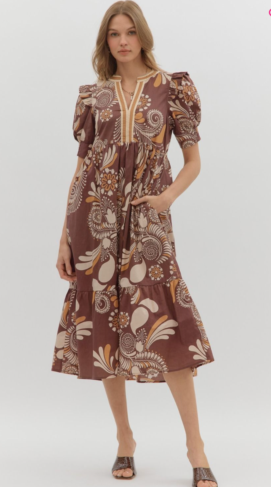 PAISLEY PATTERN MIDI DRESS - BROWN