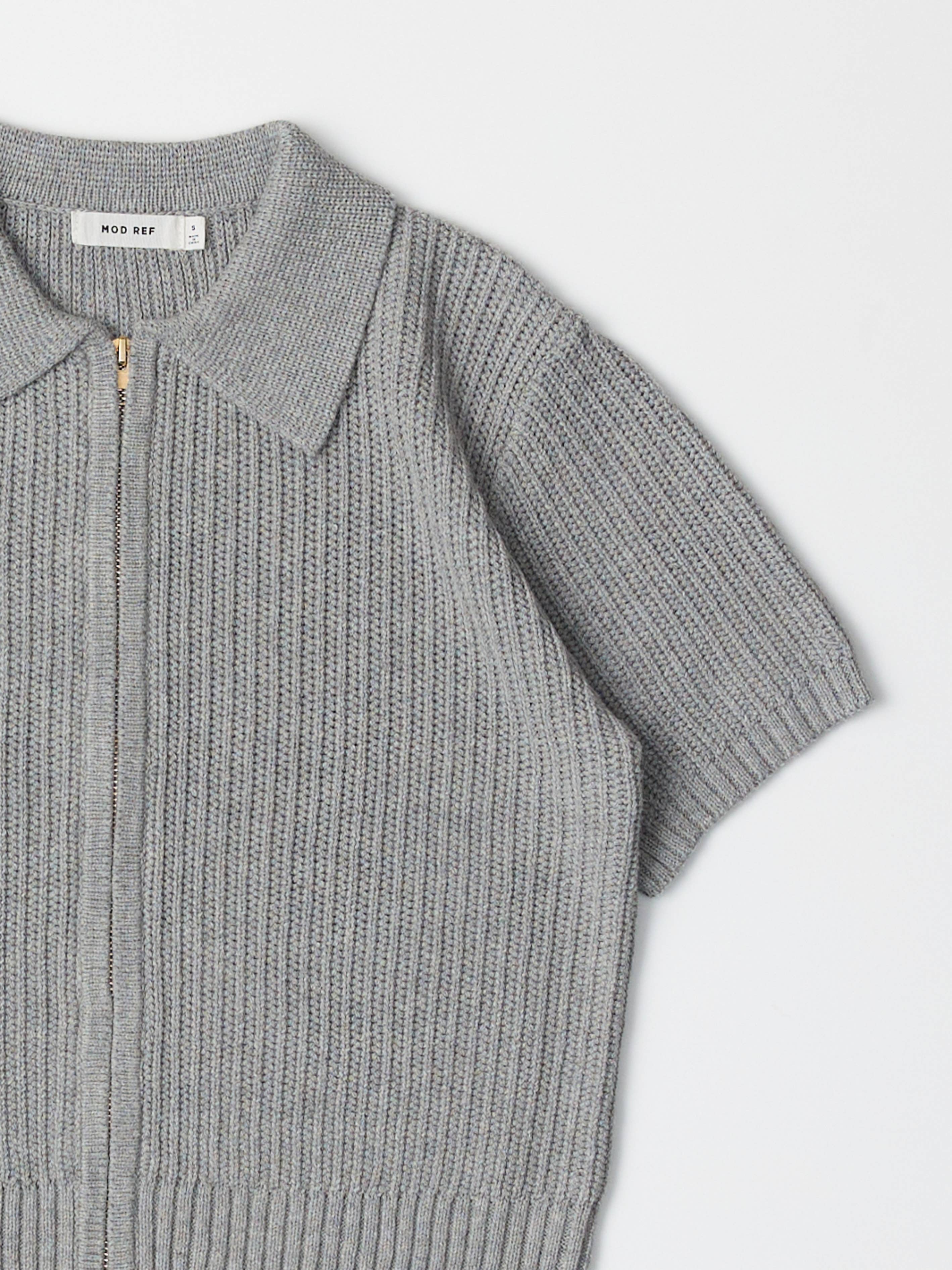 The Nadia Top is a short-sleeve knit top crafted from a midweight open knit for a breathable feel, collared neckline, and a front zip closure.