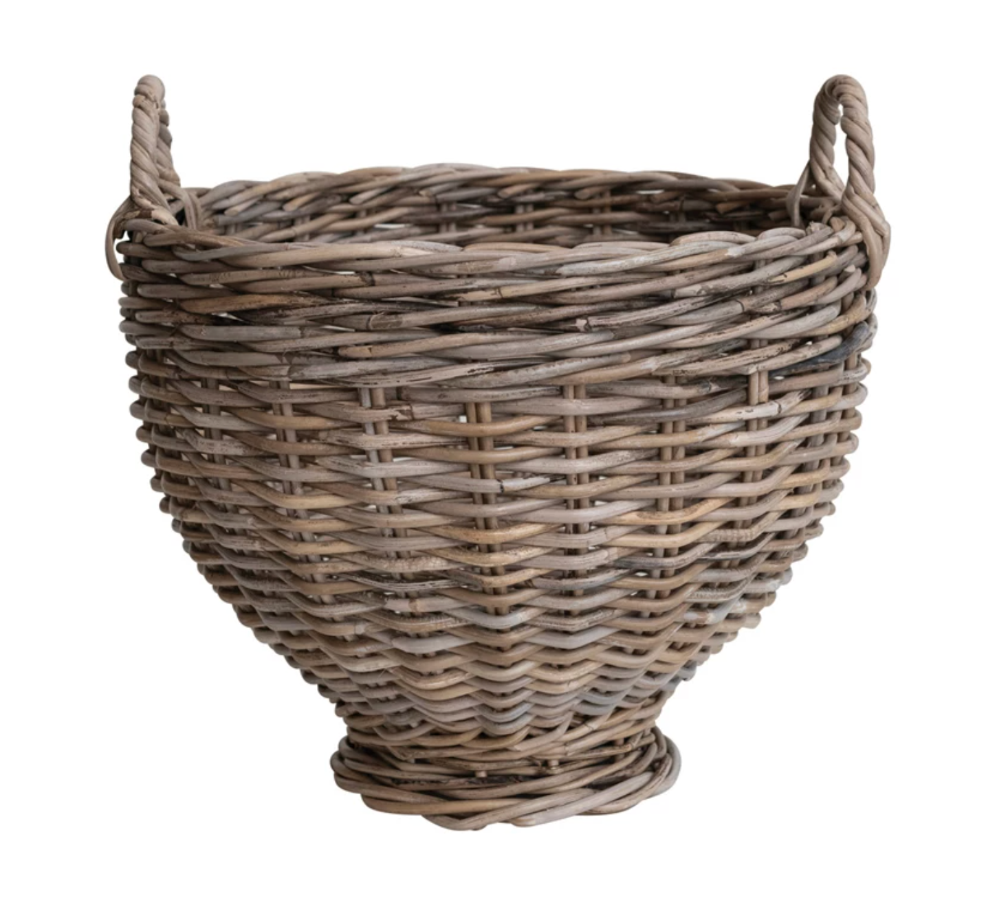 ROUND HAND WOVEN RATTAN FOOTED BASKET WITH HANDLES- IN STORE PICK UP ONLY!