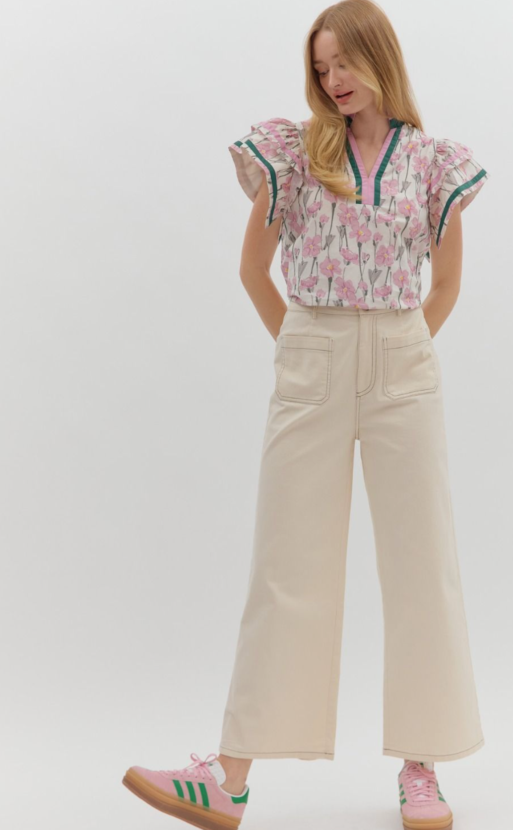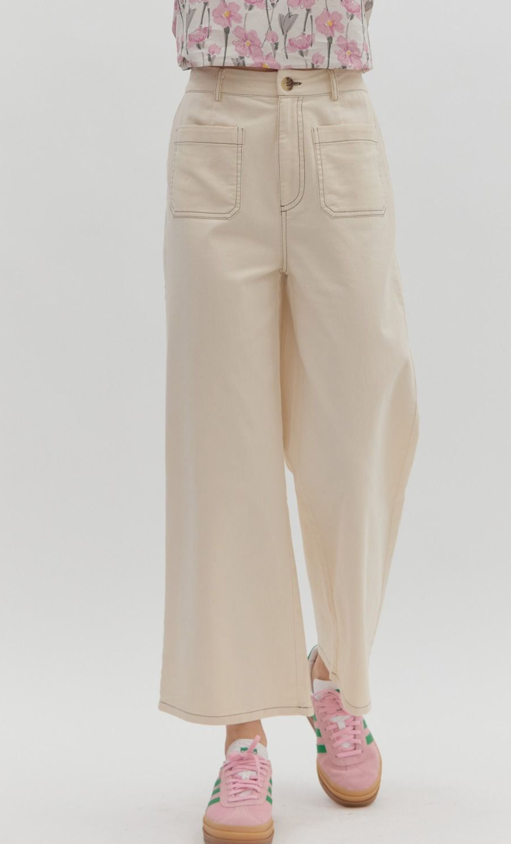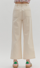 Solid high-waist front zipper closure pants featuring exposed stitch detail. Patch pockets at front and back. Unlined. Woven. Non-sheer. Lightweight.