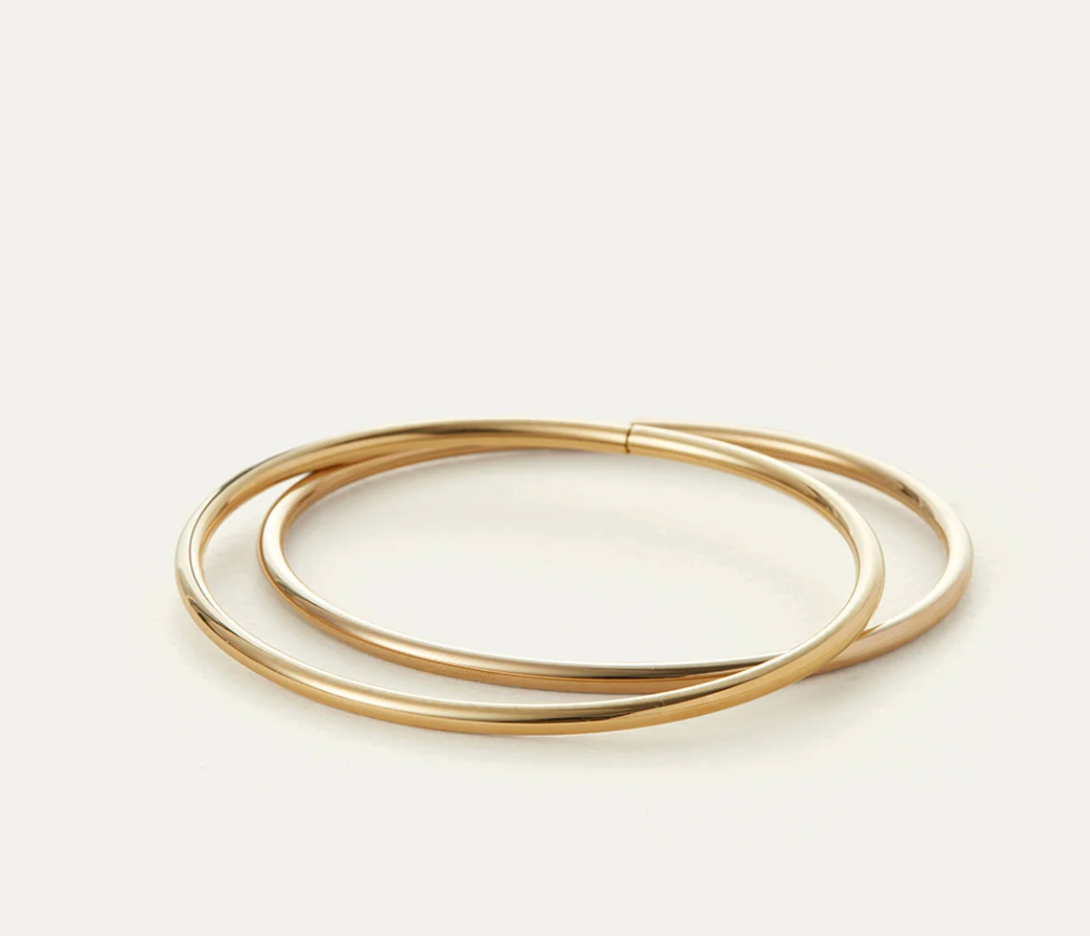 What lightweight stacking dreams are made of. Set of 2 high-shine bangles. This water-durable design brings major impact to your stacking game with zero weight. Dane is super easy to put on and remove. To open, gently pull apart the bangle at the seam, rotating the tubes in opposite directions. Close by rotating back to the seam, and inserting the smaller tube into the opening. As this stainless steel is a very durable material, it can withstand some water exposure. The perfect piece to wear if you don’t intend to take it off. The circumference measurement of the bangles are 6 1/2" and 7 3/8", so make sure to add a little extra space for comfort of movement. Finished in high-polish gold.