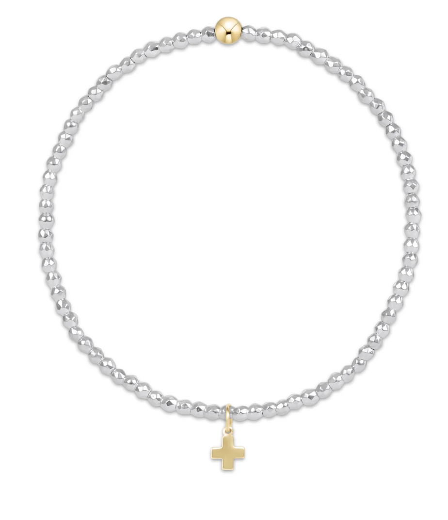 E NEWTON BRIGHT SILVER FACETED HEMATITE 2MM BEAD BRACELET - SIGNATURE CROSS GOLD CHARM