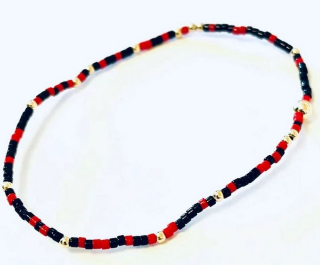 - Made with various school colors of mixed 2mm seed beads and 2mm 14k gold-filled beads