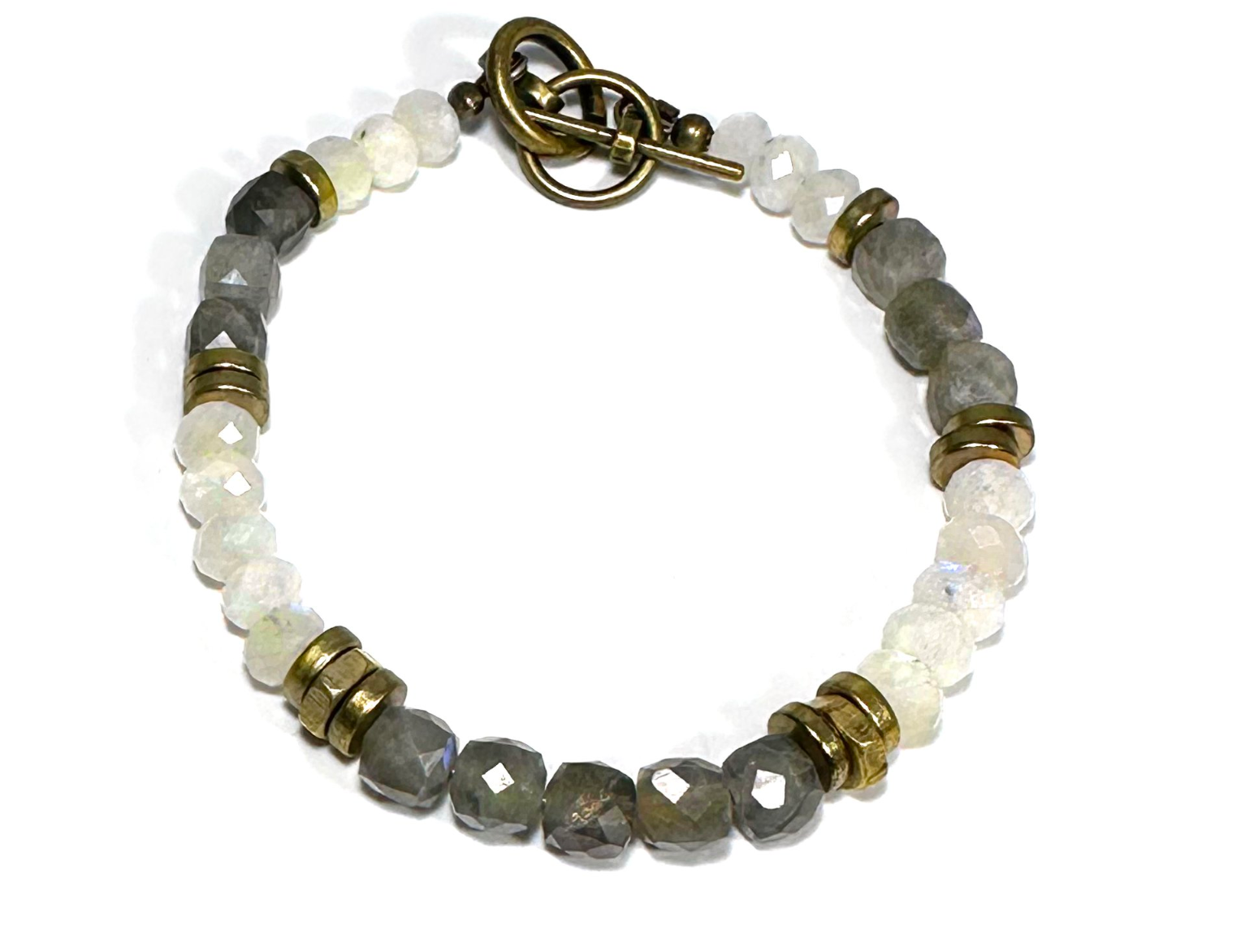 Labradorite & Moonstone bracelet finished with Indian brass accents bring together a subtle look with a statement.