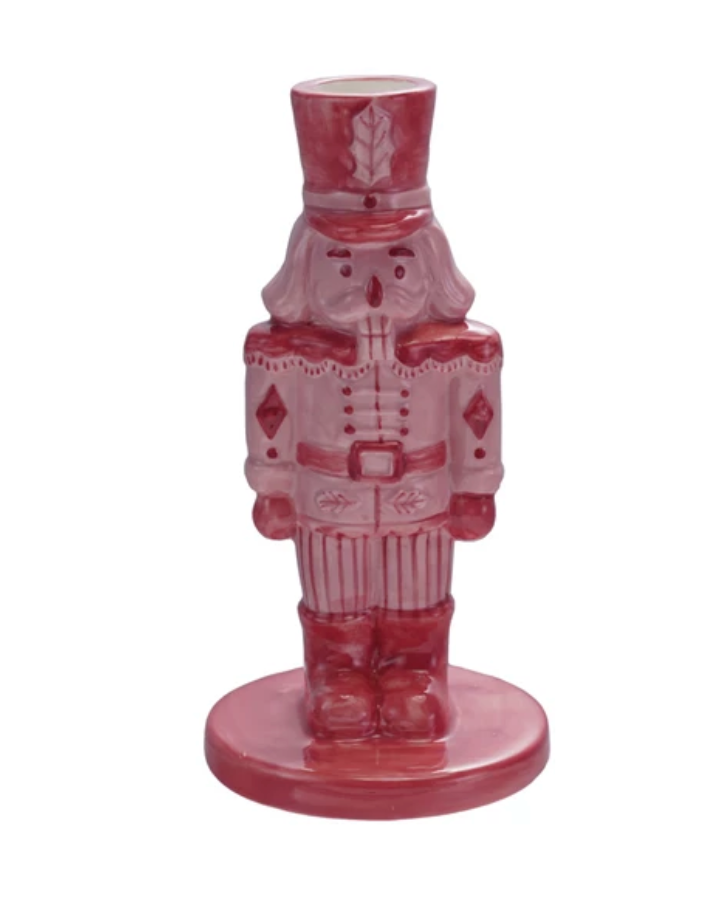 3-1/4" Round x 6-1/4"H Stoneware Nutcracker Taper Holder, Pink & Red