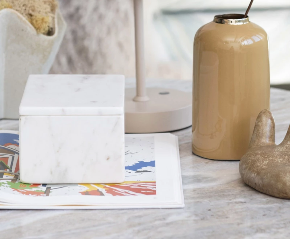 This marble box with lid is a practical and beautiful addition to the home. Made of natural marble, it has a white color that adds brightness and sophistication. Its smooth finish makes it easy to clean and maintain. The lid is snug, keeping contents secure and dust-free. The rectangular box is perfect for organizing small items like jewelry, accessories, cosmetics, stationery, or spices. It can be used as a stylish accent on shelves, tables, or desks, and can match different decor styles like Scandinavian, boho, global, modern, or French country. This marble box is a great way to enjoy the beauty and functionality of marble in the home or a thoughtful gift for those who love natural and refined products.