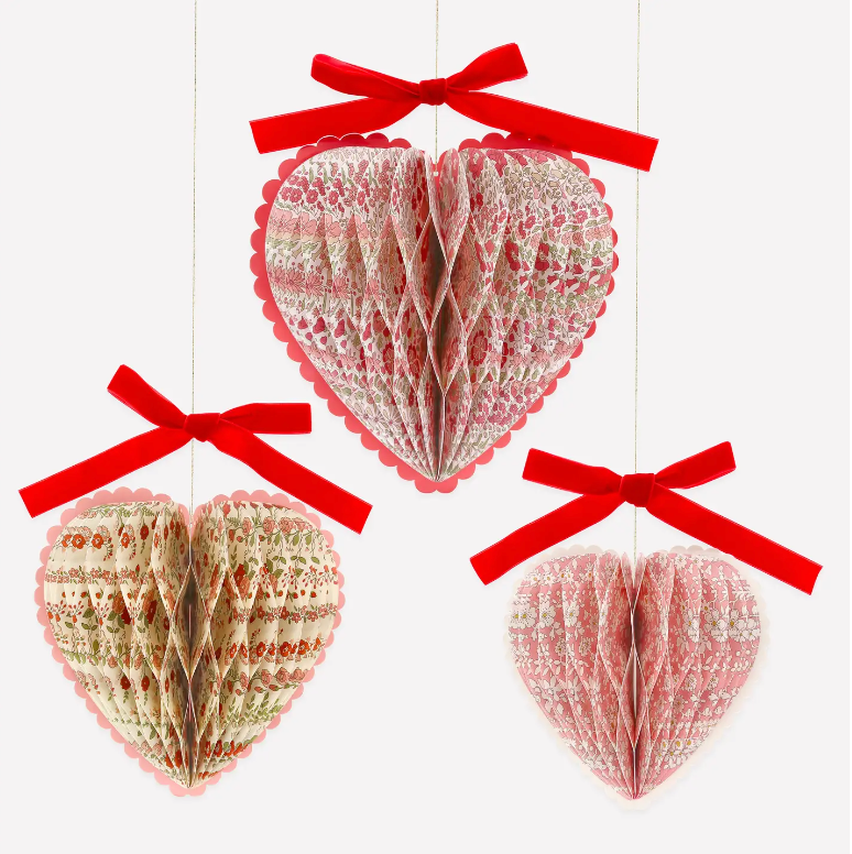 Three honeycomb heart decorations, in three sizes, each with a different Liberty floral design in pink and red tones * Scalloped edges in complementary tones * Red velvet ribbons tied in a stylish bow add an elegant embellishment * Hidden magnets hold the honeycomb open for a stunning effect * Gold metallic cords for hanging * Simple self assembly required * Pack of 3 in 3 sizes * Product dimensions: Small - 6 inches, Medium - 7 inches, Large - 8 inches