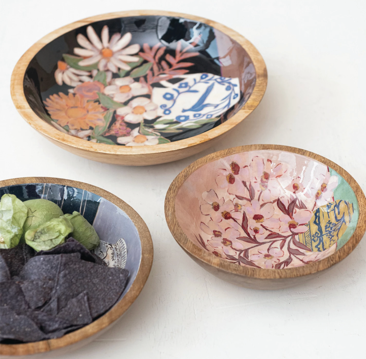 11-3/4" Round x 2-1/2"H, 9-1/2" Round x 2-1/2"H & 8" Round x 2-1/2"H Enameled Mango Wood Bowls w/ Flowers in Vase, Multi Color