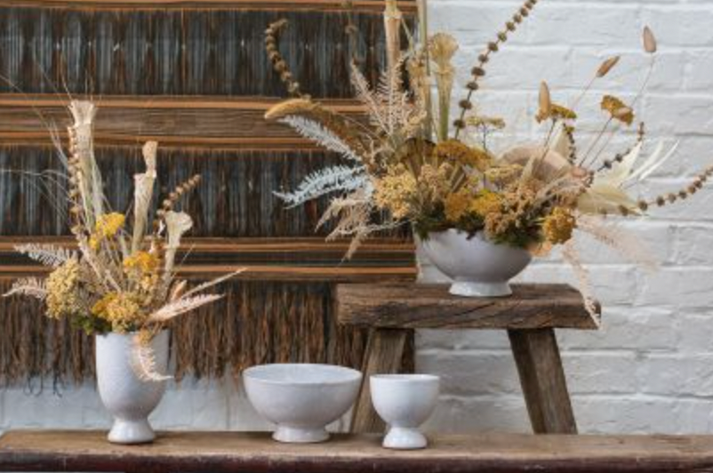 Handmade with two-toned glaze and thin slices of white ceramic, the Grayton Compote is a one-of-a-kind piece beautiful enough to stand alone as art, or for your next floral design.