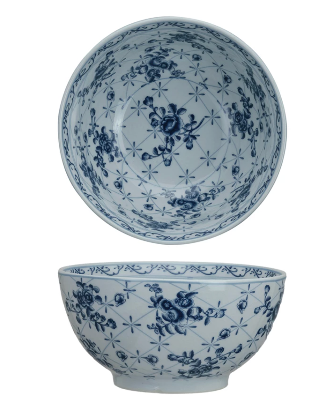 10" Round x 4-1/2"H Hand-Stamped Stoneware Bowl w/ Botanicals, Crackle Glaze, Blue & White (Each One Will Vary)
