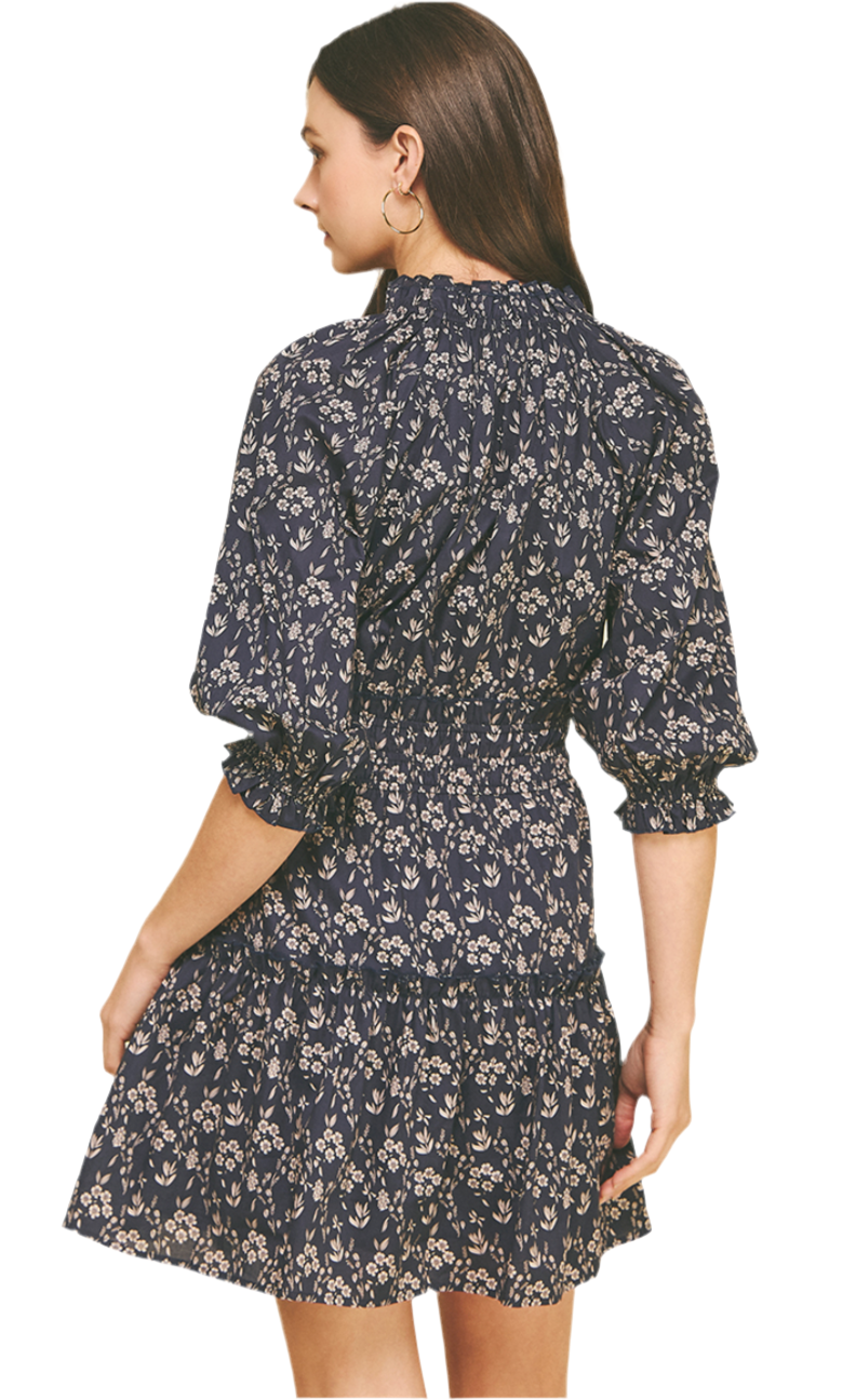 FLORAL BALLOON SLEEVE MINI DRESS - NAVY