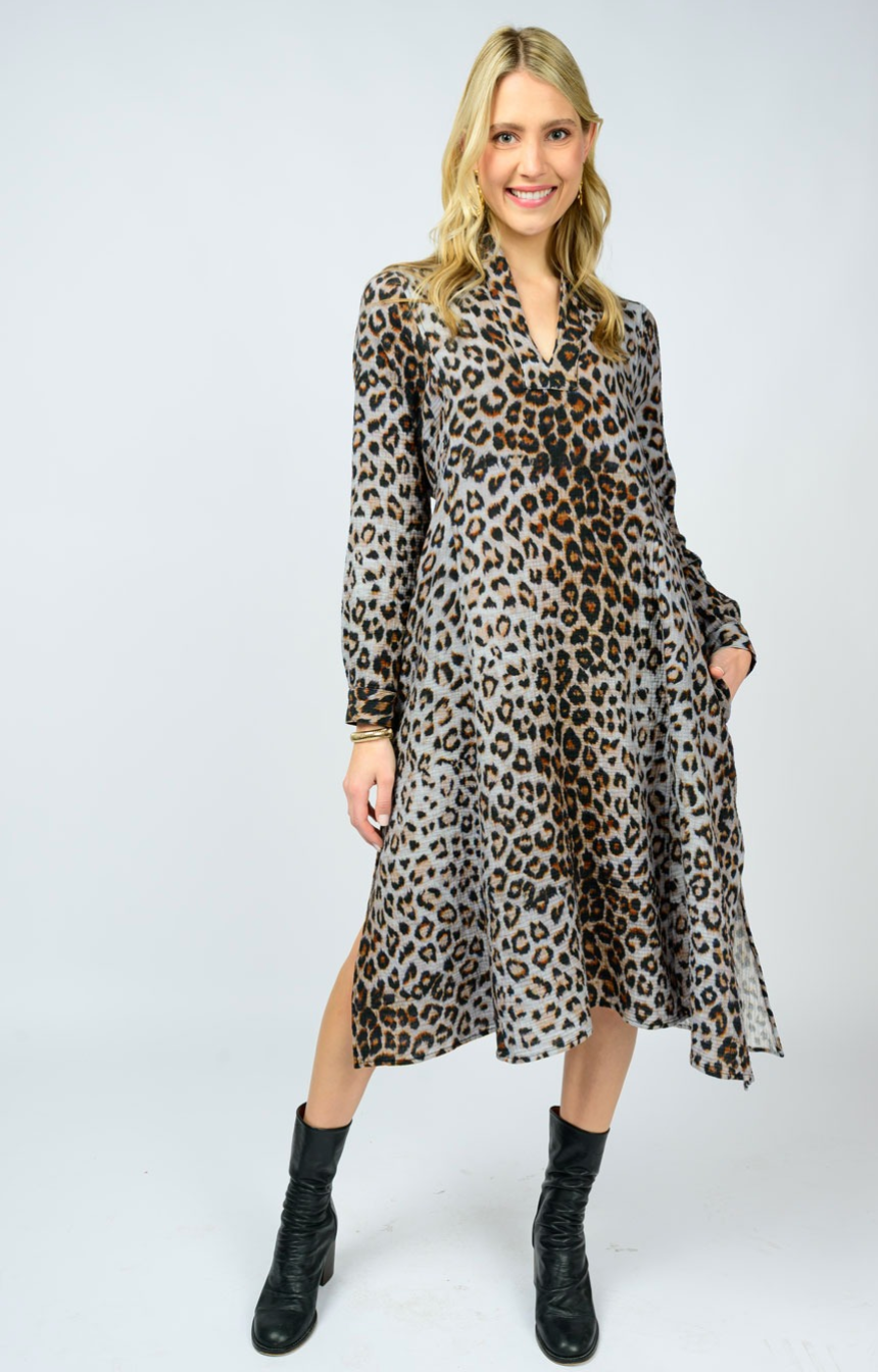 LEOPARD GAUZE MIDI DRESS - GREY