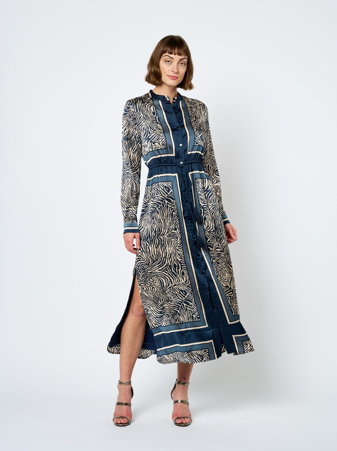 BORDER PRINT TIE WAIST BUTTON DOWN DRESS - TEAL BLUE MULTI