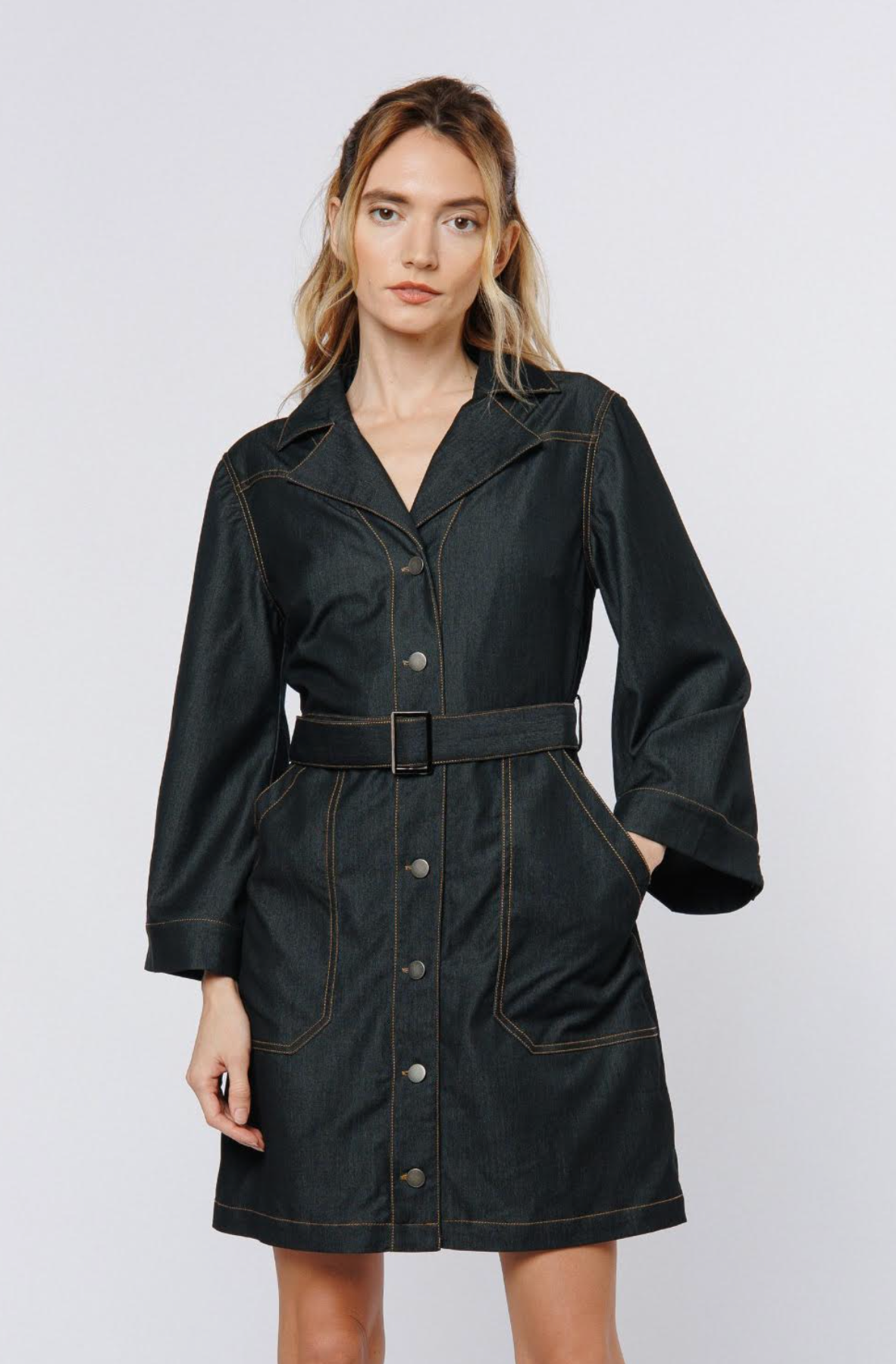 COCO LONG SLEEVE DRAWSTRING SHIRT DRESS - NAVY