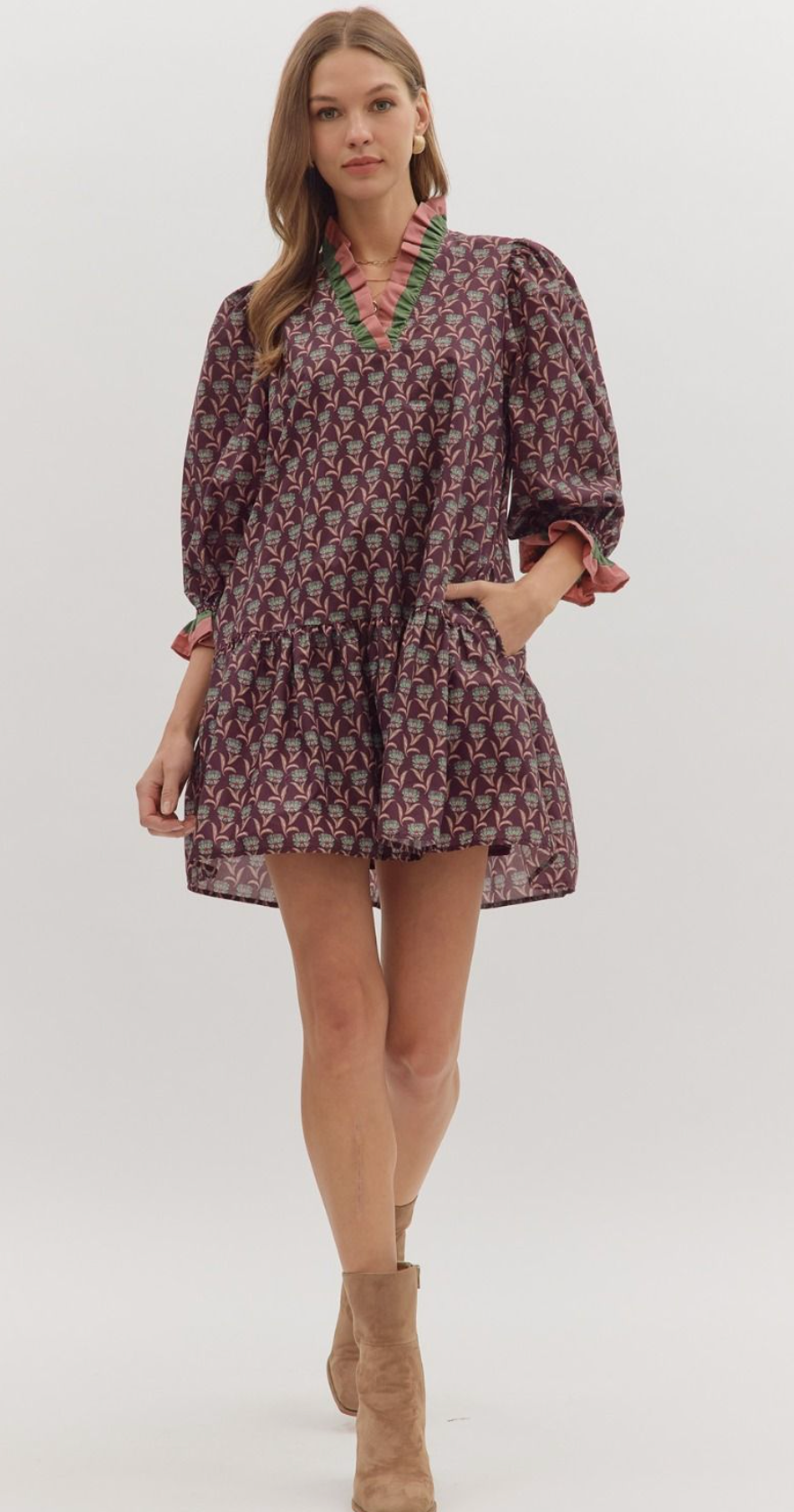 Floral print 3/4 puff sleeve mini dress featuring contrast ruffled trim V-neck. Contrast ruffle cuffs. Ruffle hem. Side pockets. Lined. Woven.