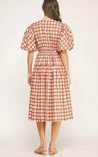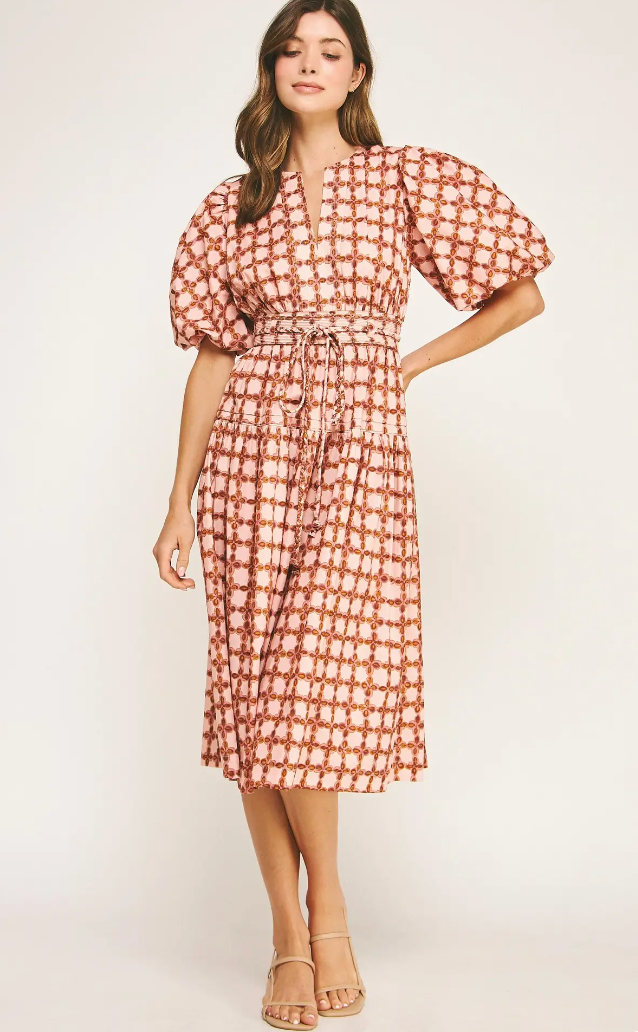 Studio Strut and Bolt Collection. Puff short sleeve midi dress in an exclusive flower chainlink checkered print on poplin fabric This long dress features puff short sleeve, a split V-neck, side pockets, midi skirt, side zipper closure, pintuck detail at shoulder/skirt, a removable waist tie, and cinched banded waist with stretch smock at back.