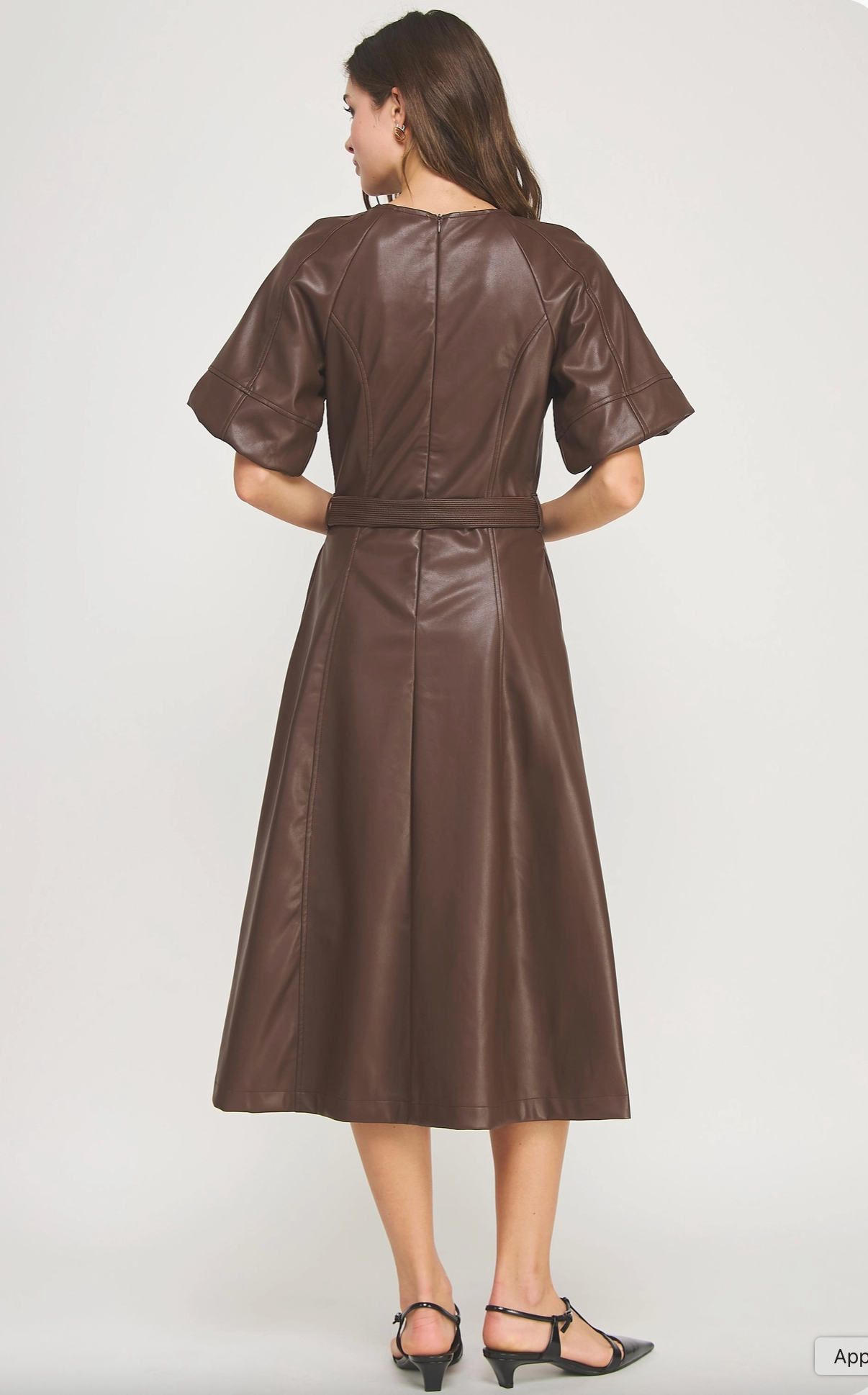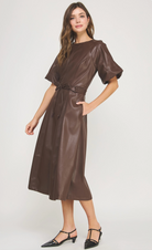 Studio Strut and Bolt Collection. Waist belt detail midi dress in faux leather fabric. This chic versatile long dress features raglan puff short sleeve, a removable quilted belt with tie closure, side pockets, round neckline, lining, and hidden zipper closure.