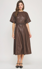 FAUX LEATHER MIDI DRESS WITH BELT - MOCHA MOUSSE