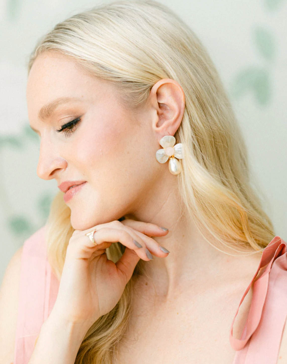 A favorite bridesmaid gift, The Matilda is a keepsake to cherish long after the wedding. These lightweight floral earrings feature mother-of-pearl petals, a luminous pearl center, and a lustrous acrylic pearl drop that catches the light with every step. Comfortable for all-day wear—from the ceremony to the last dance—they complement both classic gowns and modern silhouettes. The Matilda is the perfect finishing touch for a romantic wedding look.