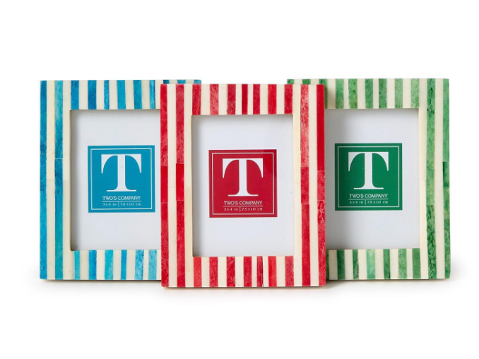 Elevate your cherished memories with our Celebration Stripe Mini Photo Frame. Handcrafted from bone, each frame is a unique work of art. The vibrant red, blue, and green stripes add a pop of color to any space, whether displayed horizontally or vertically. Perfect for showcasing your favorite snapshots, these frames bring a touch of whimsy and style to any room.