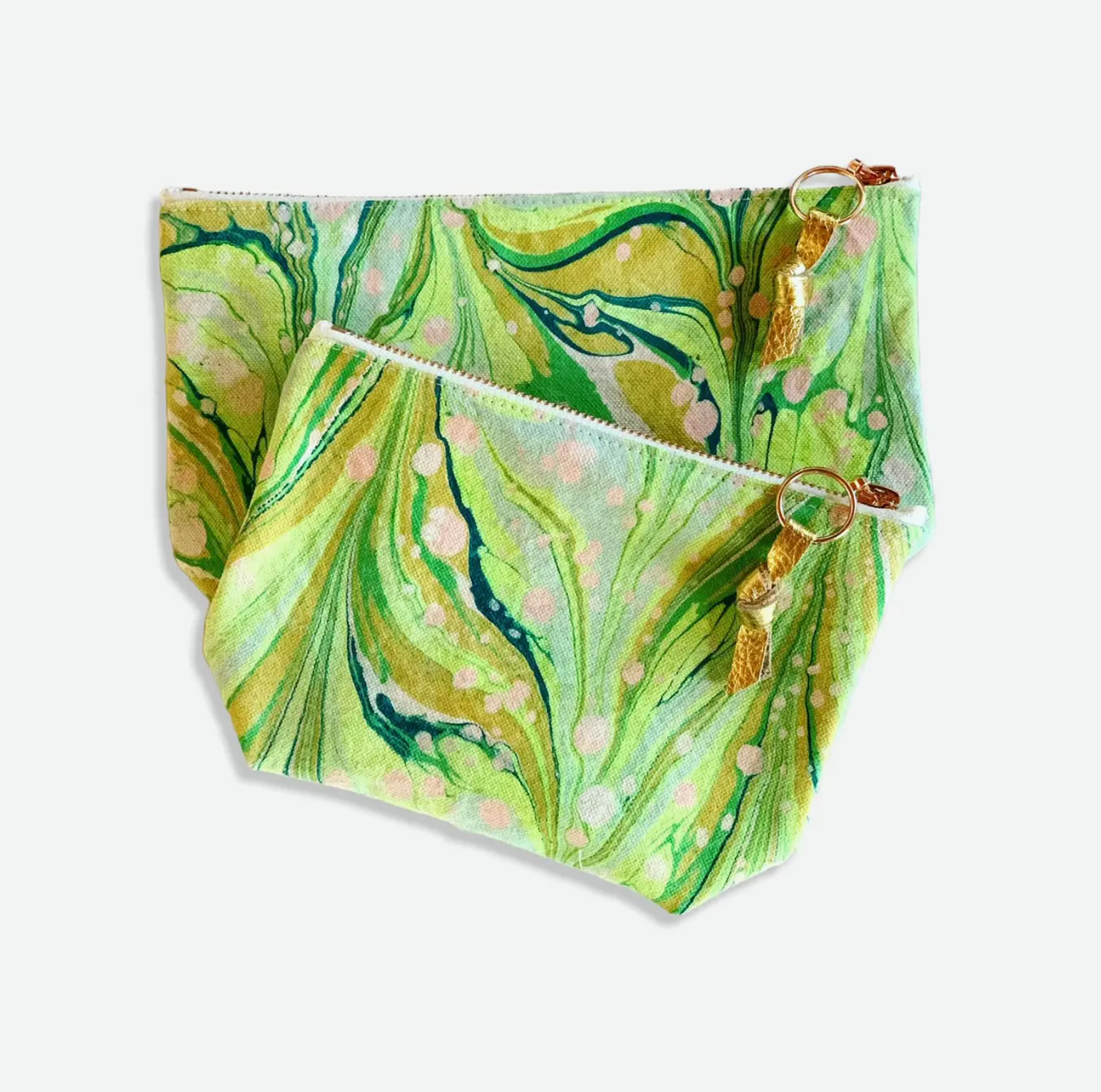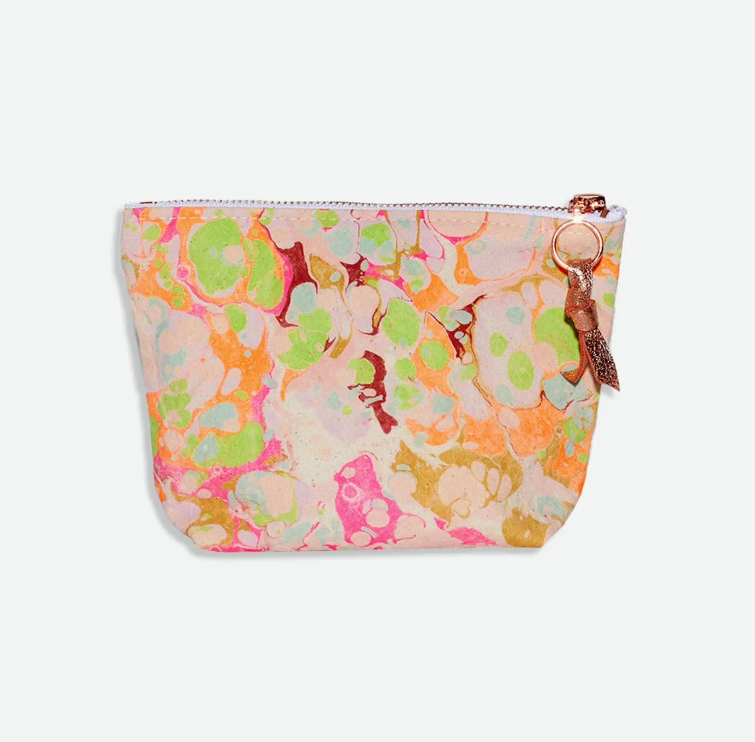 Hand marbled panels of mill end cotton canvas are done in studio and then sewn into these marvelous canvas pouches perfect for all sorts of objects and accessories, or to use as a cute clutch. Unlined with recycled metallic leather zipper pull.  All Marbled fabric is one of a kind. Minor imperfections are inherent of the process. Every one is hand made to order.