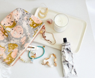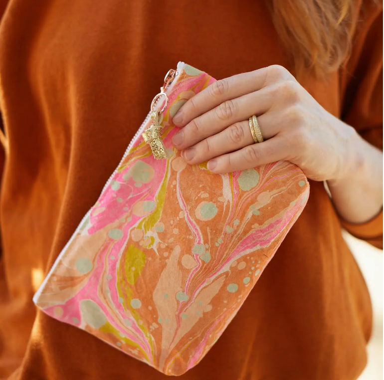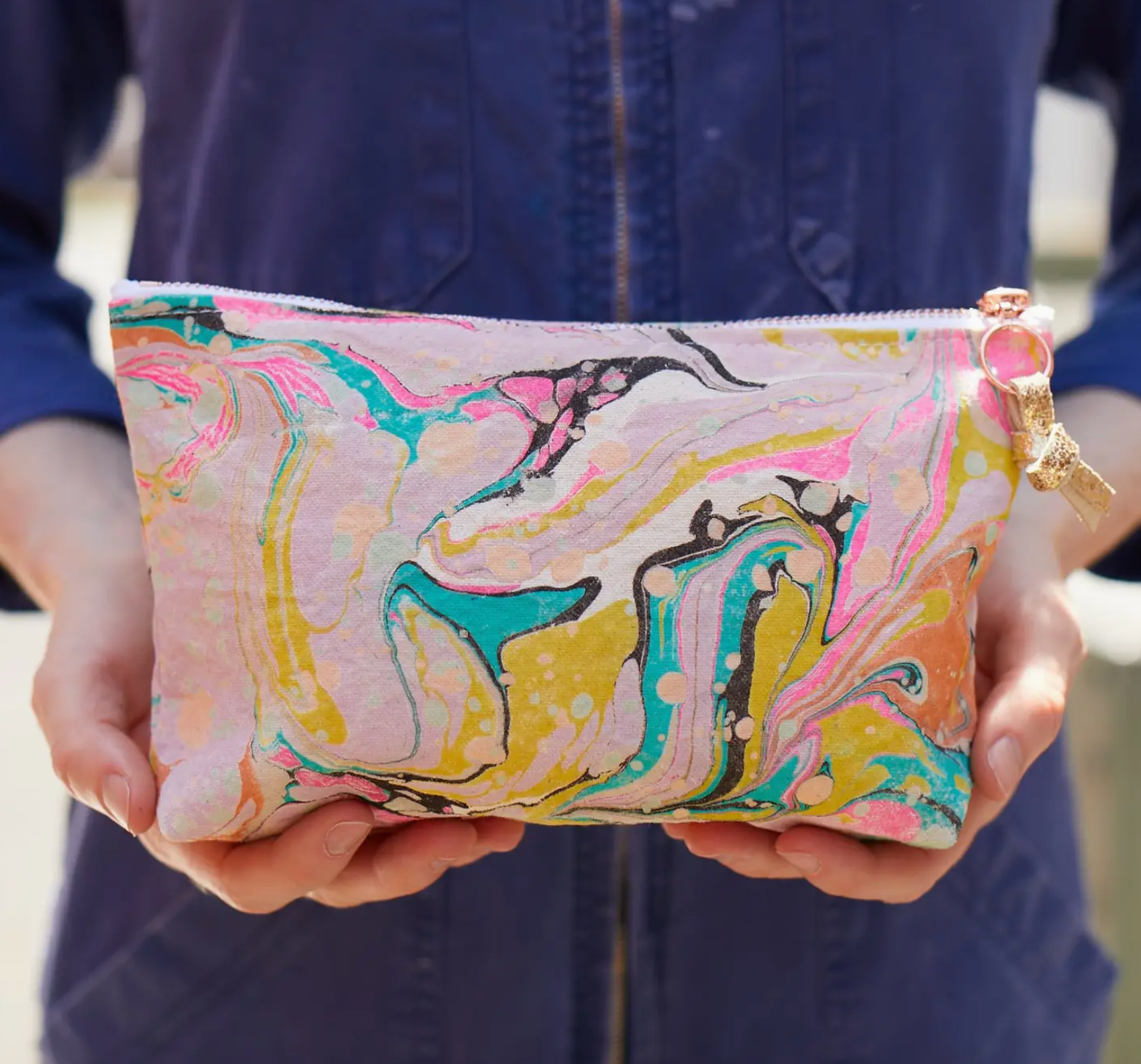 Hand marbled panels of mill end cotton canvas are done in studio and then sewn into these marvelous canvas pouches perfect for all sorts of objects and accessories, or to use as a cute clutch. Unlined with recycled metallic leather zipper pull. All Marbled fabric is one of a kind. Minor imperfections are inherent of the process. Every one is hand made to order.