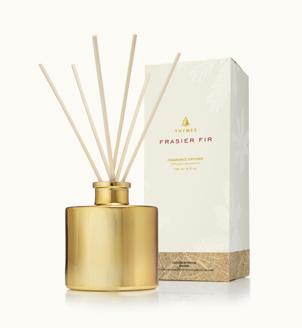 Perfectly sized to fill cozy spaces with the crisp fragrance of Frasier Fir, this 4oz Gold Petite Reed Diffuser is a stunning accent piece for any home.