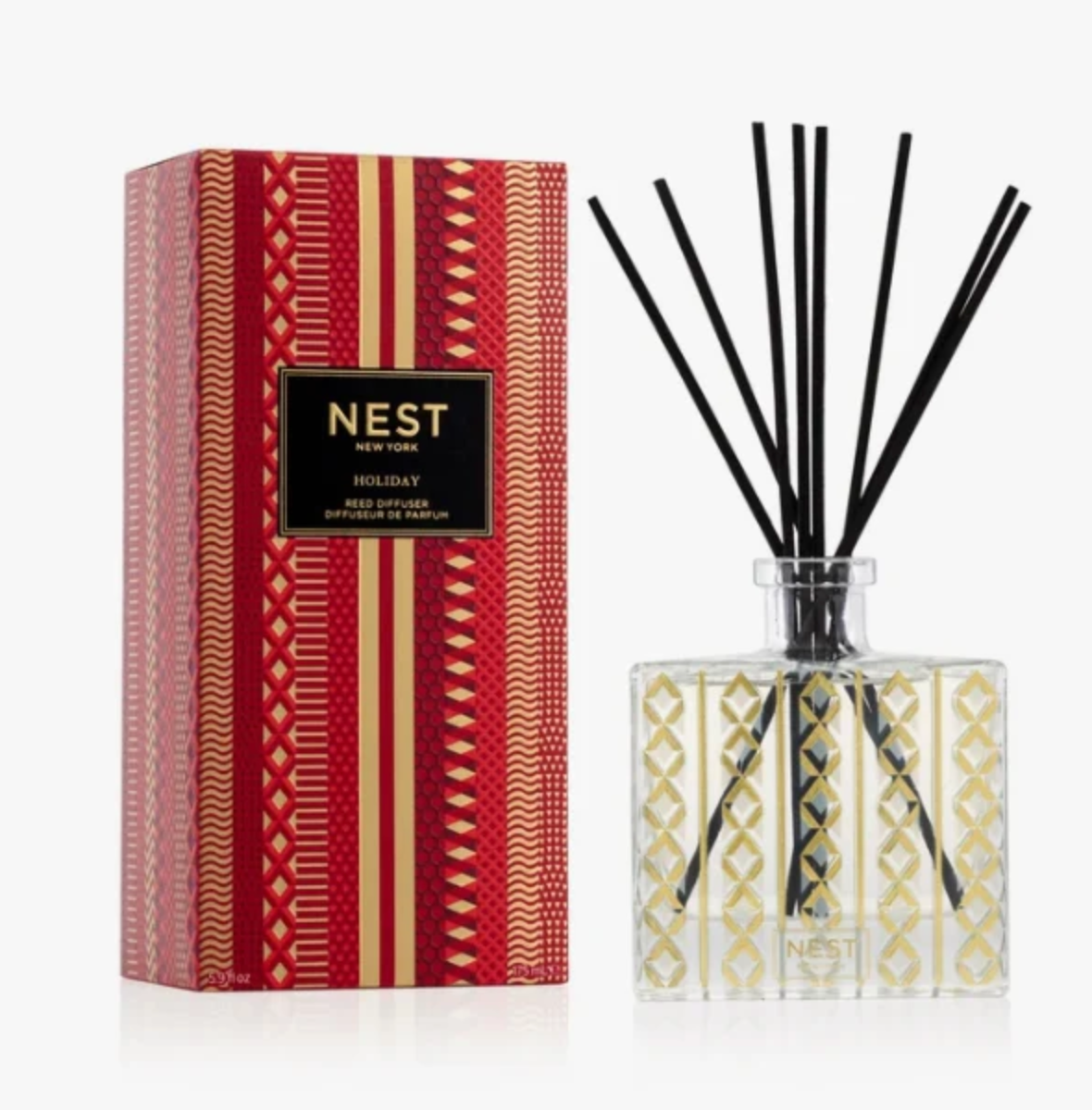 Release the quintessential aroma of the season with this bestselling fragrance, Holiday. Reeds absorb the exquisite fragrance and releases it into your room. The diffuser blends the iconic scents of pomegranate, mandarin orange, pine, cloves, and cinnamon with a hint of vanilla and amber. Matches not required.