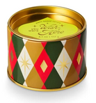 A holiday themed tin with bold, gift wrapped patterns and a gold metallic interior for a touch of holiday shine.