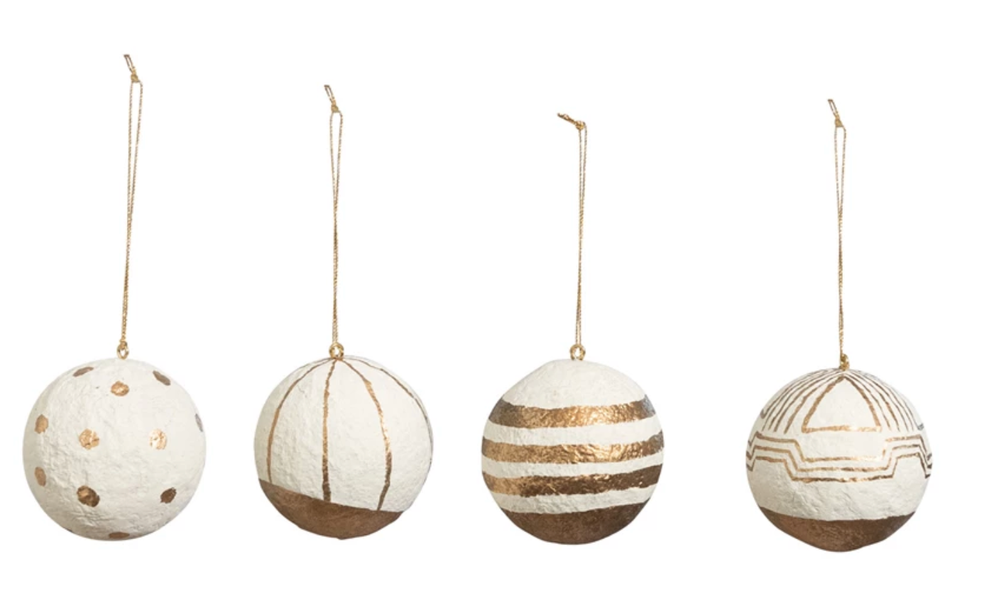 3" Round Hand-Painted Paper Mache Ball Ornament, Cream & Gold Color, 4 Styles