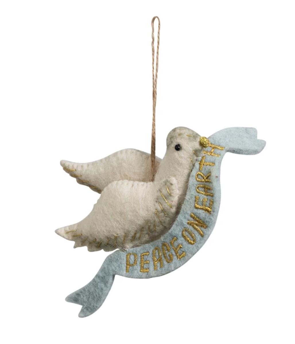 HANDMADE WOOL FELT DOVE ORNAMENT WITH EMBROIDERED BANNER