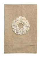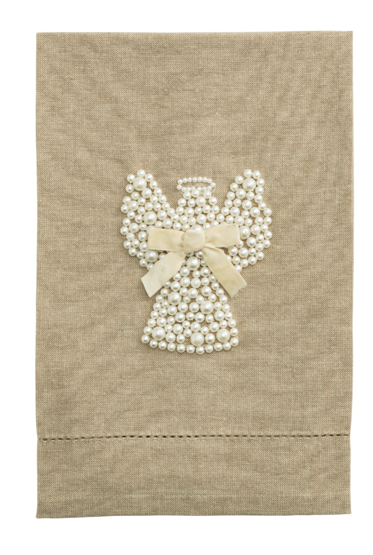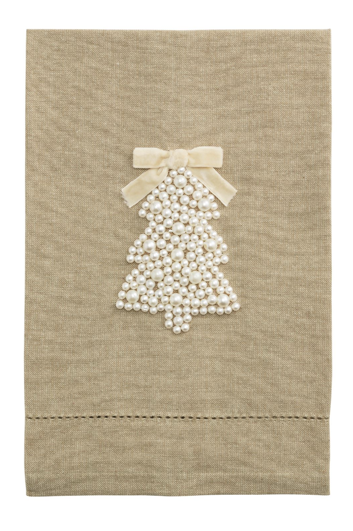 Chambray hand towel features pearl bead appliqué with velvet bow and hem stitching.