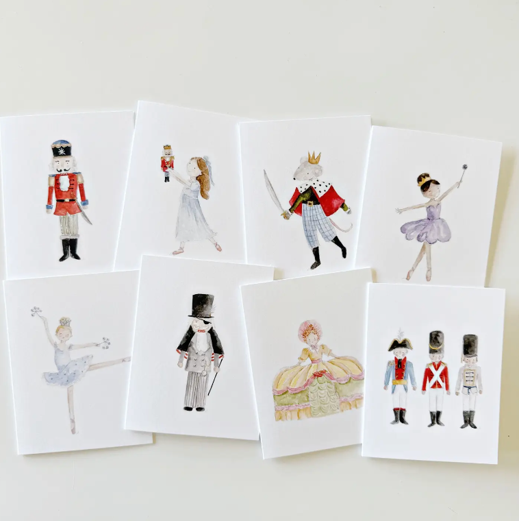 Send sweet greetings to your loved ones. The assorted set of nutcracker notecards are blank on the inside with charming watercolor illustrations of the Nutcracker Prince, Clara, Mouse King, Sugarplum Fairy, Snow Queen, Drosselmeyer, Mother Ginger, and Toy Soldiers on the front. They bring a touch of delight to your thank-you notes, Christmas cards, hostess gifts, and more.