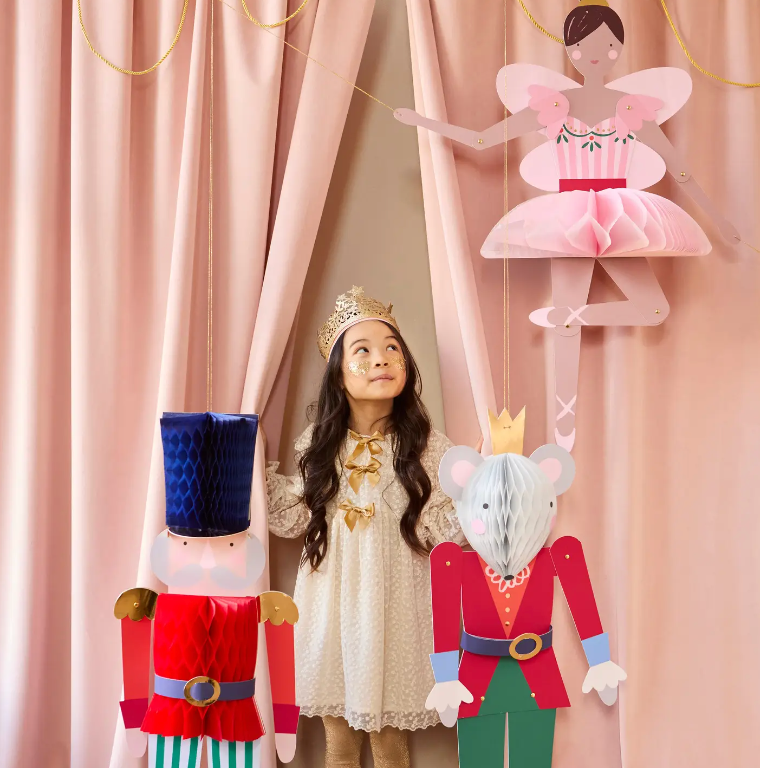 Giant Nutcracker hanging decorations of The Nutcracker soldier, Sugar Plum Fairy and the Mouse King, with honeycomb and shiny gold foil details * 3D Tissue paper honeycomb details on the hat and body of The Nutcracker; tutu of the Sugar Plum Fairy, and head of the Mouse King * The honeycomb has hidden magnets to easily hold it open * Loop-in paper belts for The Nutcracker and Mouse King * Small gold tone paper fasteners allow for movement to position the characters' arms and legs * Metallic gold thread hanging loops, and metallic gold thread details on the Sugar Plum Fairy's hands *