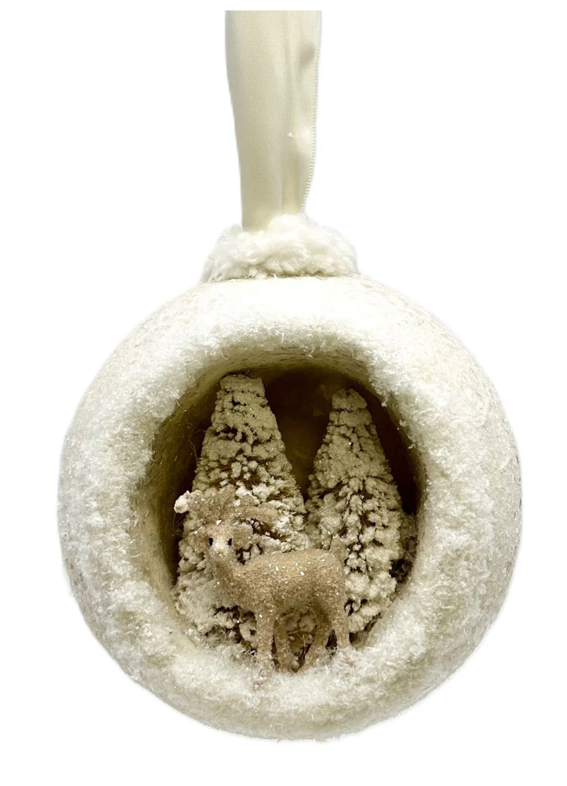 Our Peek-A-Boo Ornament is a glittery snowball with a twist! Inside this shimmering cream-colored sphere, you'll find a delightful surprise—a tiny fawn with flocked trees. Perfectly finished with cream-colored faux fur trim around the opening and at the base of a luscious satin ribbon for hanging. It's the most charming touch your holiday decor will ever have.