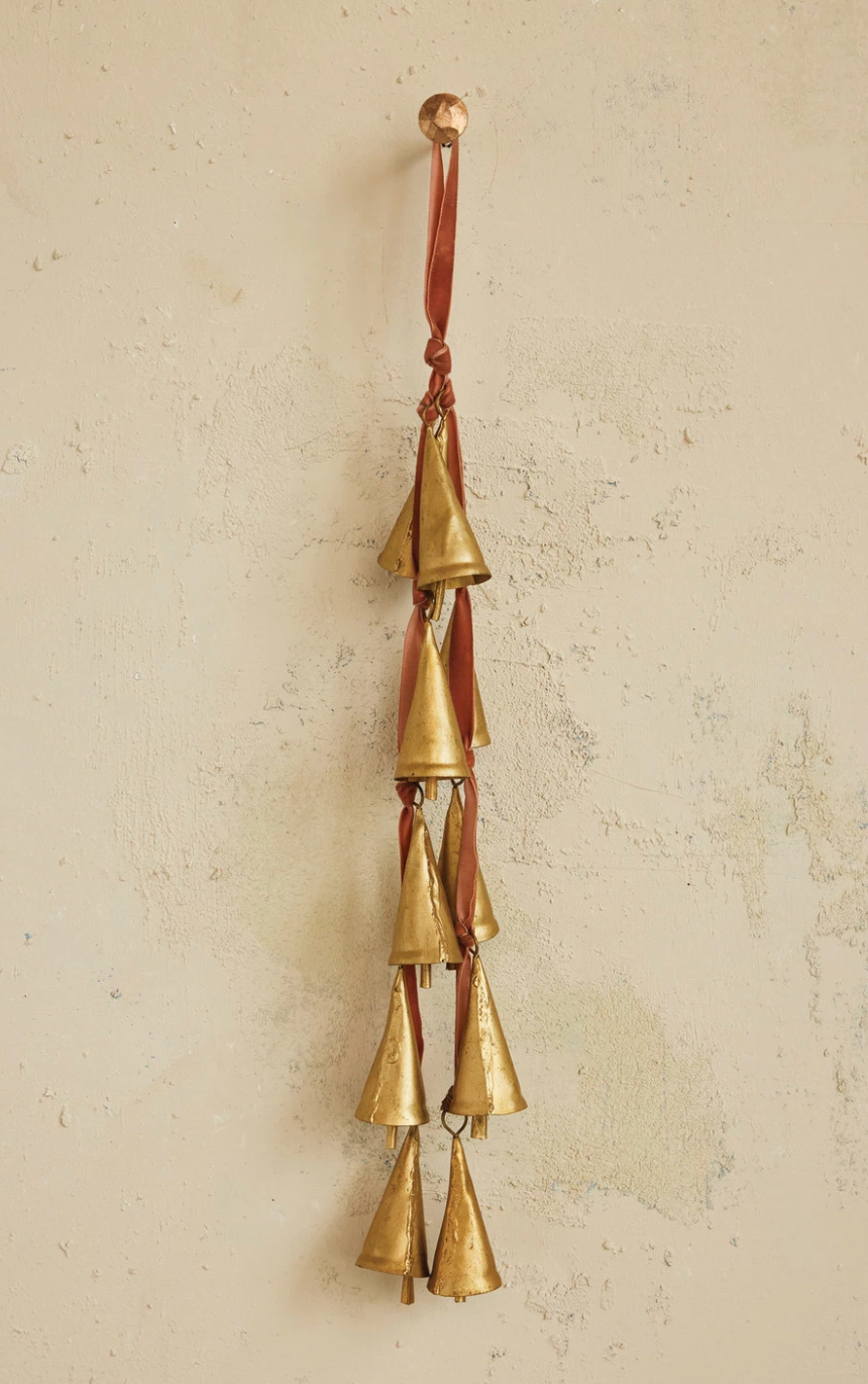 16"H Velvet Ribbon Door Hanger w/ 10 Cone Shaped Bells, Rose Color & Gold Finish