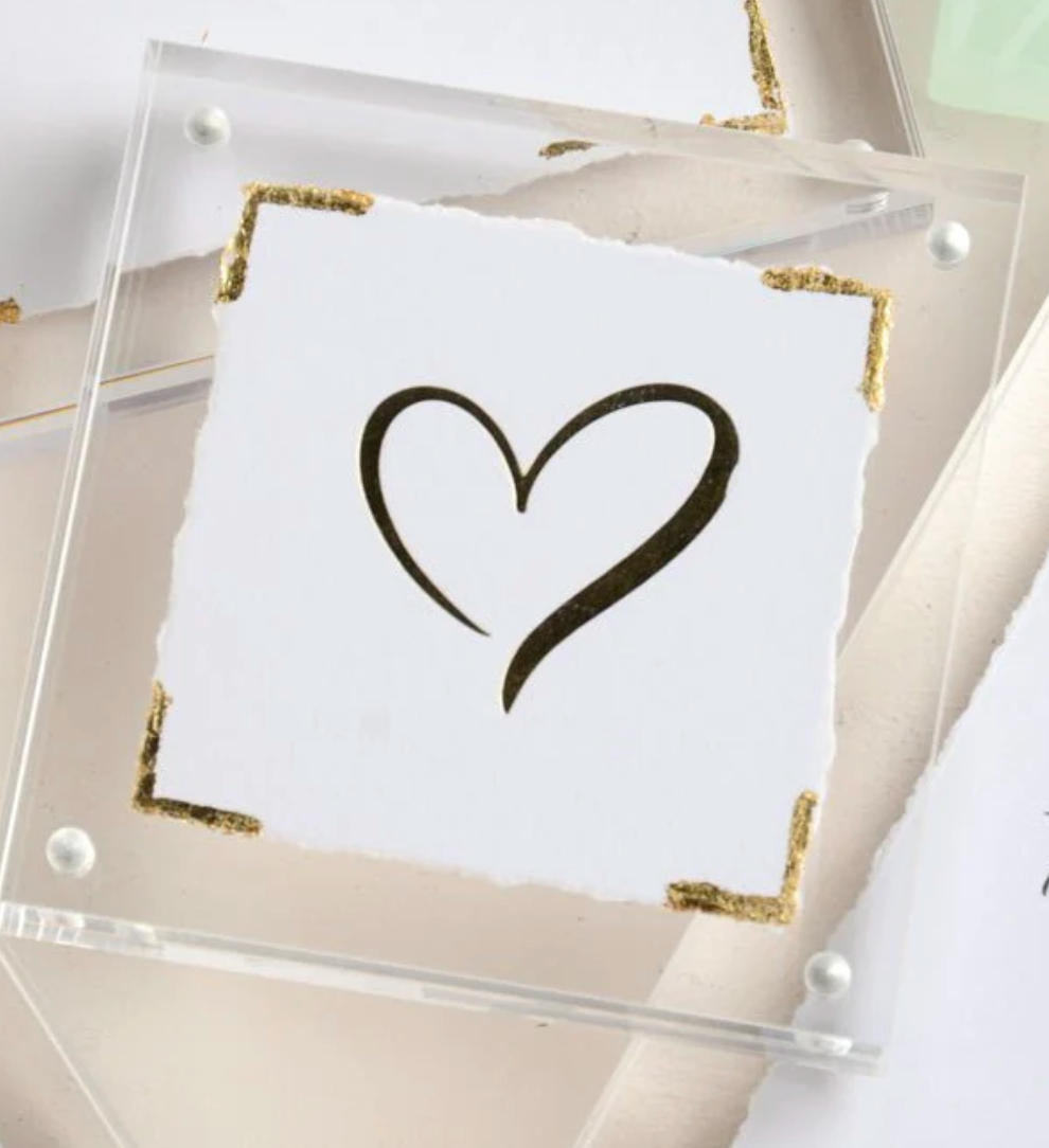 Each piece is handmade and features beautiful recycled paper with torn edges, hand-scripted style lettering in black, elegant gold leaf corners & displayed in a stunning, high-quality acrylic frame.